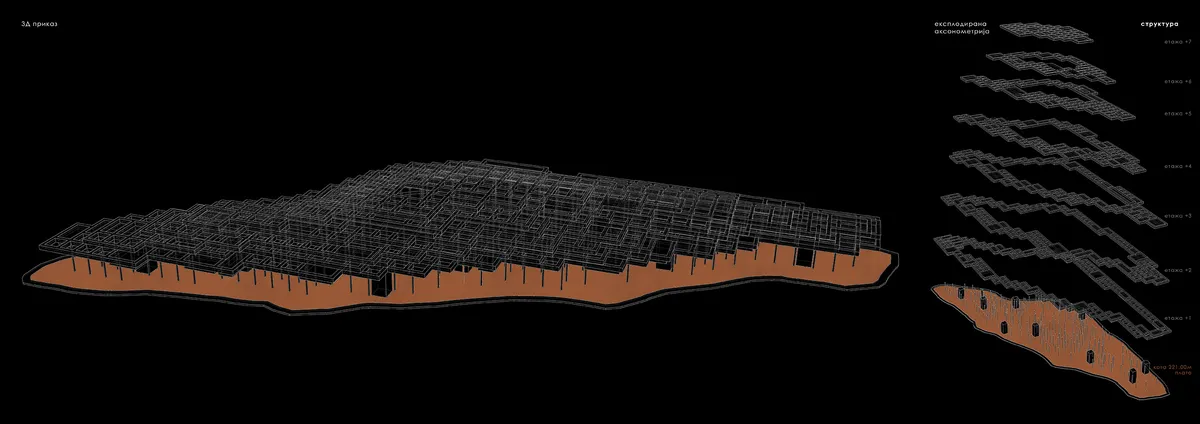 The "elevation 221" project envisages the construction of the Super-university in Zvezdarska šuma. The location is significant because of its strategic position or its presence in the city sights. Through its position and appearance, this project should initiate certain social changes, that is, to affirm young educated people. "Elevation 221" is actually a platform formed by cutting the terrain at an elevation of 221 meters. It is actually the link between the Star Forest, access communications and the object itself, and as such represents a meeting place, an event. The design of the building was derived from the existing shape of the terrain. The form is now geometrized. A new naturalness is also achieved by the "forest" of pillars and trees that follow the characteristics of the context.
