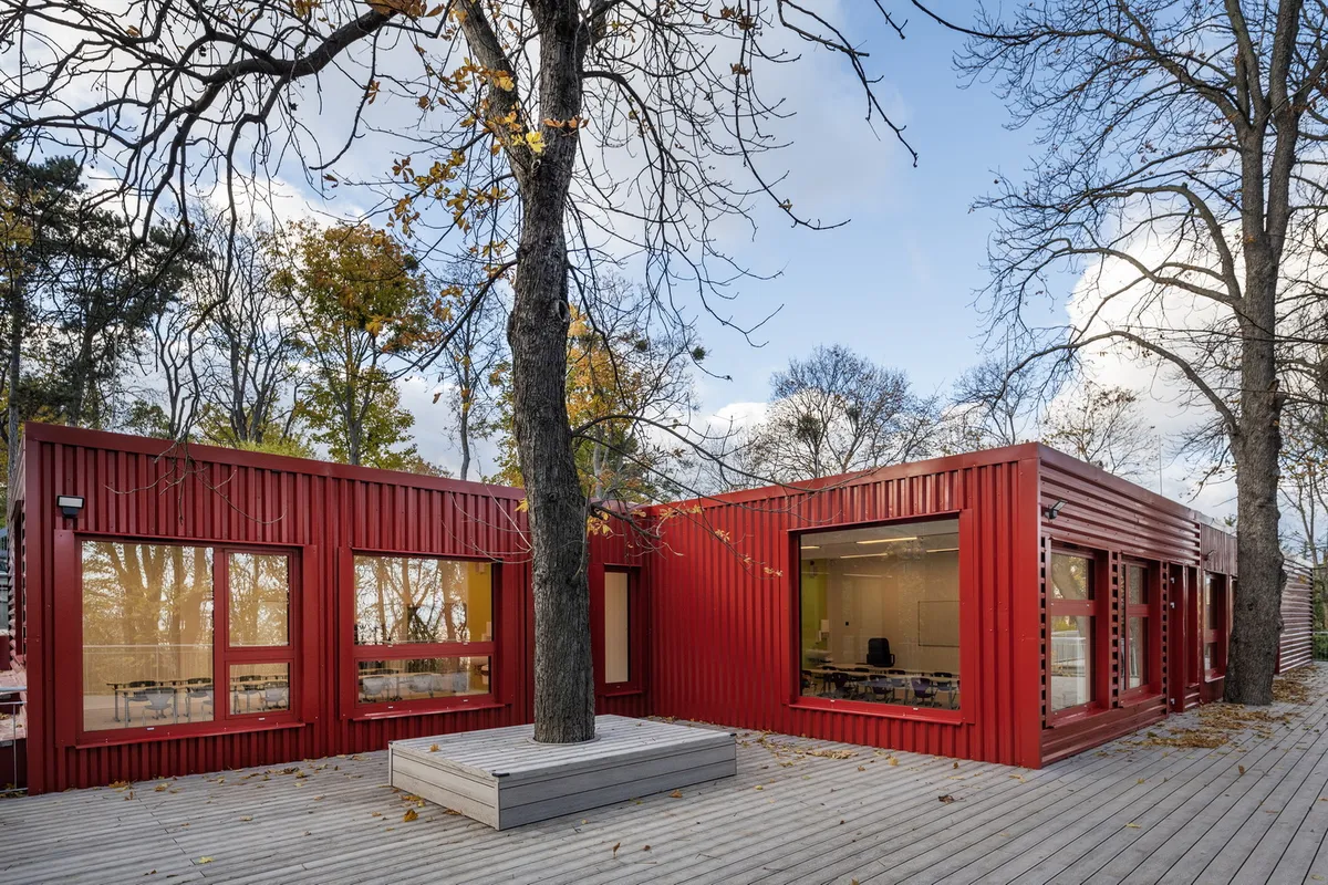 The need for expansion arose at the German School of Budapest. Due to the start of the school year, a rapid response was required. Therefore, the development of an existing container building to a higher quality, with increased capacity, and an architectural character befitting the built and natural environment was envisaged.
