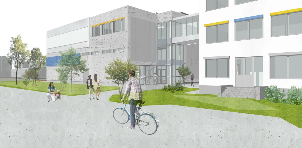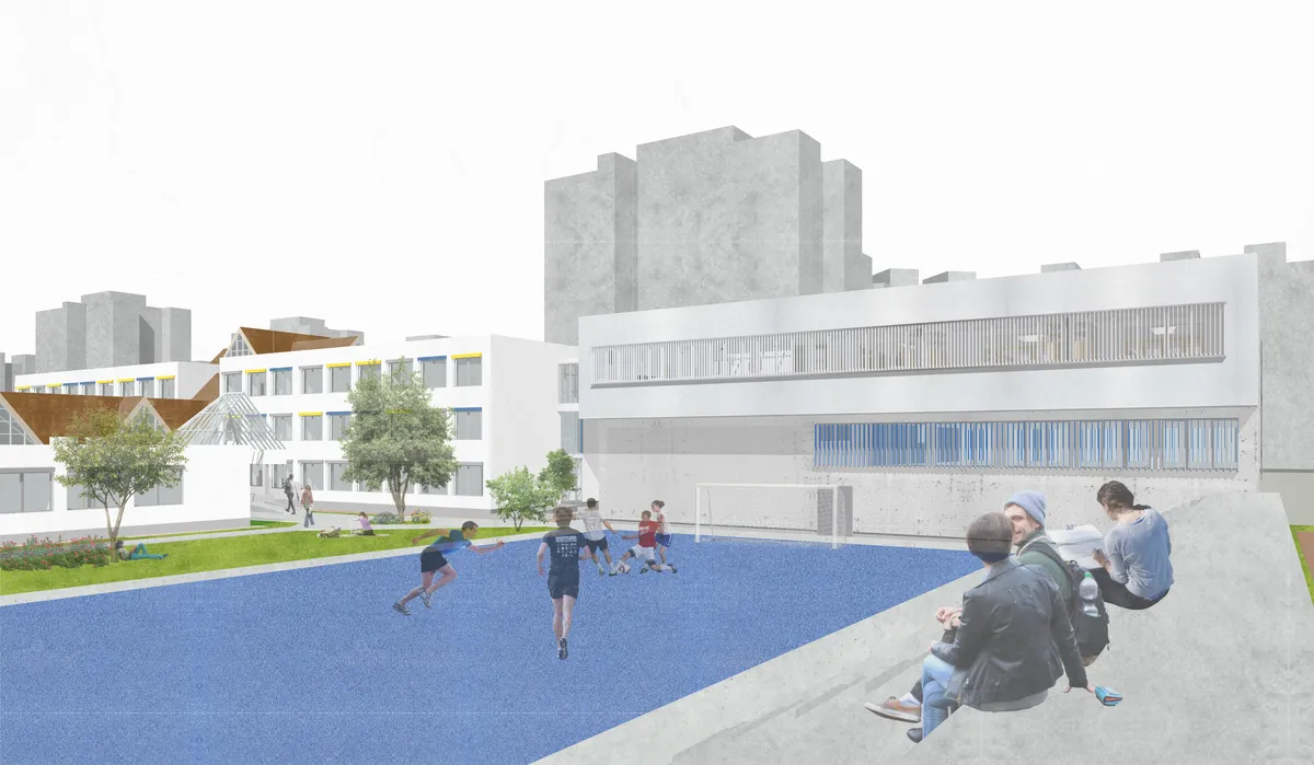 My diploma was the expansion of my former high school. My choice was motivated not only by my personal attachment and experience, but also by the school's bidding efforts to expand. The school is located in Tócóskert in Debrecen. As there is no cultural centre near, the exhibition area of the high school is the only leisure option. The school currently rents 6 external rooms. This means not only physical but communal detachment for the arts and dance classes: the planned extension will provide space for these. The school maintains the adjacent museum, but does not own it, so it was not possible to place the extension here. The original school courtyard is a barrier to full use during events, which has been remedied by landscaping. The positioning of the extension responds to the existing building: it is connected via a bridge on the ground and second floors, the extension matches the exdisting building mass. On the ground floor there is an exhibition space and a dance hall optionally divided in two by an acoustic wall. This can be converted into a 100-seat auditorium with a retractable stage, and is also suitable for film projection. Functions that are accessible to outsiders have been placed on the ground floor to ensure that the intimacy and security of the school. Secondary functions are located on the first floor. It was important to involve the whole range of pupils in the bloodstream of the extension by creating a community space and classroom on the second floor. The dance hall is bridged with a level-high trellis with a section of vierendeer at the walkway. I deliberately did not follow the existing school's mid-aisle circulation system, which is a dark dead-end. I moved it out by one median, giving it natural lighting in it's entire length. In the art rooms, diffused light is provided by opal glass louvres in front of the openings and by a white stretch film that can be pulled out under the overlights. For cost-effective construction, I designed a precast reinforced concrete frame structure with core-insulated reinforced concrete wall panel . The maximum building height is 11m: The reduction of the slab thickness was achieved by using a mule structure. The interior walls are decorated by the students. The facade cladding reflects the design of the structure: the metal support is clad in white sheet metal, the wall panels in textured concrete. I indicated the nature of the functions with openings and a sculptural work on dance sign language.