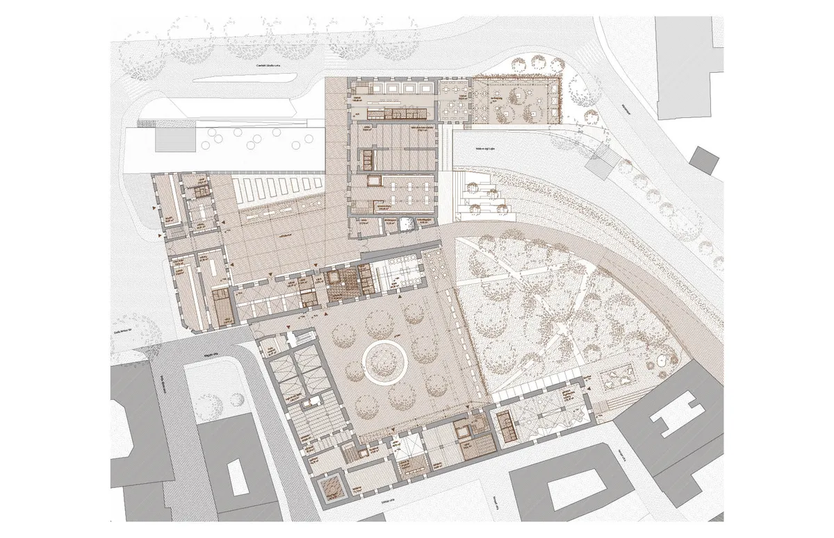 MAIN LEVEL - I have arranged the main level with architectural and landscape interventions. An important part of my concept was the integration of the courtyards in the area into the urban fabric, the creation of new passages using existing connections, and the creation of access to the Lajta waterfront. Architectural interventions will be implemented in the interior and exterior spaces to serve the new functions with minimal intervention.