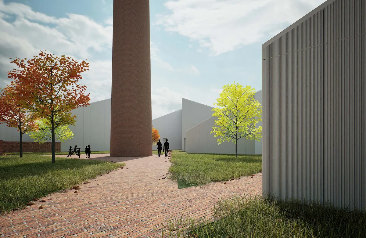 An integral aspect of the architectural concept, symbolising the area's heritage, involves laying out elements of the current buildings like a carpet on the ground. Emerging from this "green-brick carpet" are the monolithic, snow-white masses of the new development.