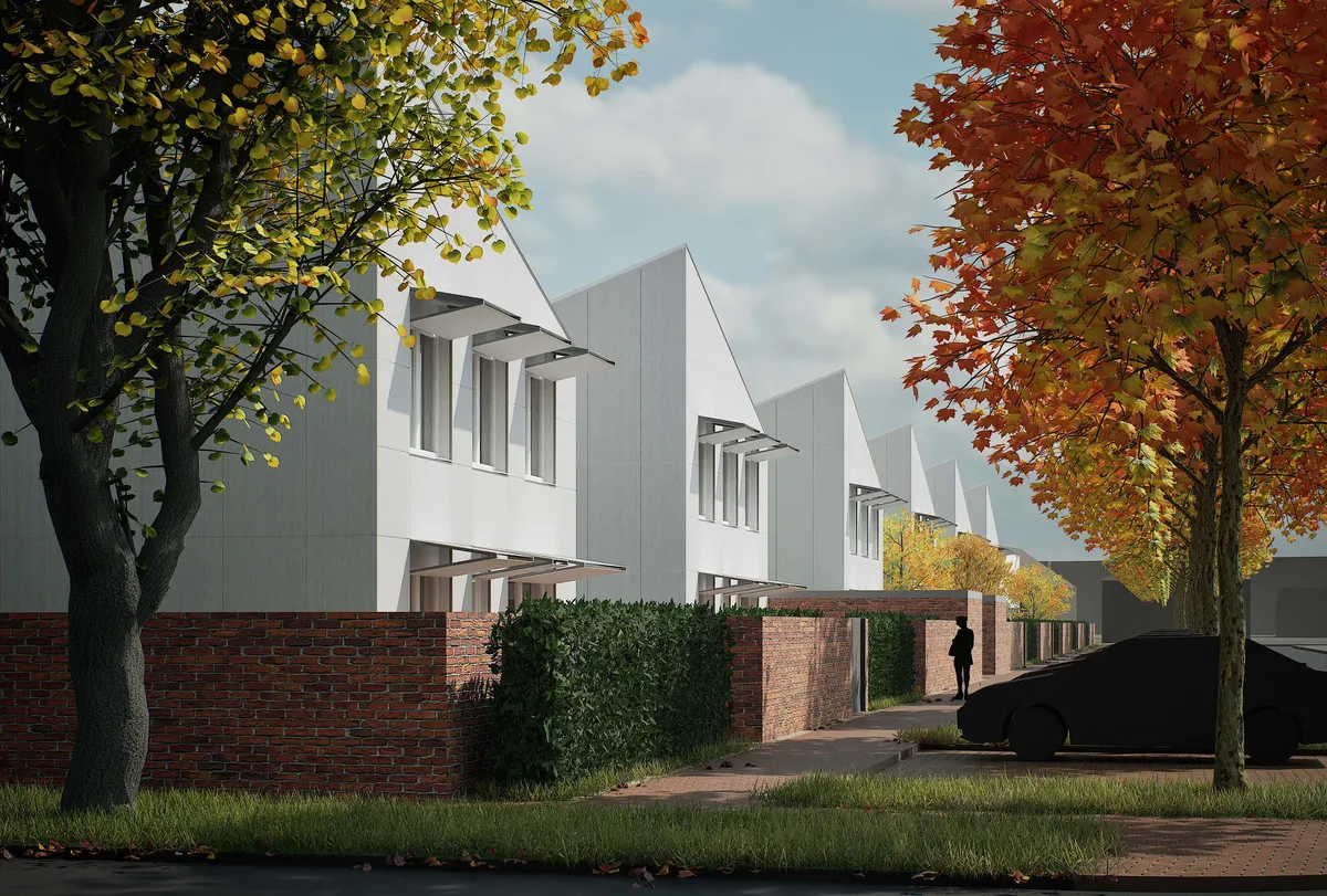 The majority of the development consists of 3 types of house. The grid, which defines the development, measures 9x9 metres. It aligns with the street line, becoming higher and denser at the busiest street at the northern edge (Gergely utca), enclosing but also turning inward and opening up toward the block's interior, creating dynamic internal spaces. Two focal points within these spaces preserve elements from the existing development. These spaces are accessible only to residents. The alternation of the masses of the houses ensures that the private garden areas are completely intact. The purpose of the roof geometry is to ensure optimal lighting in the gardens and dwellings. The facade is characterised by a special system of upward-opening shading devices, which are finished with same fibre cement as the facede. The development area is designated car-free, with parking on the new street to the south.