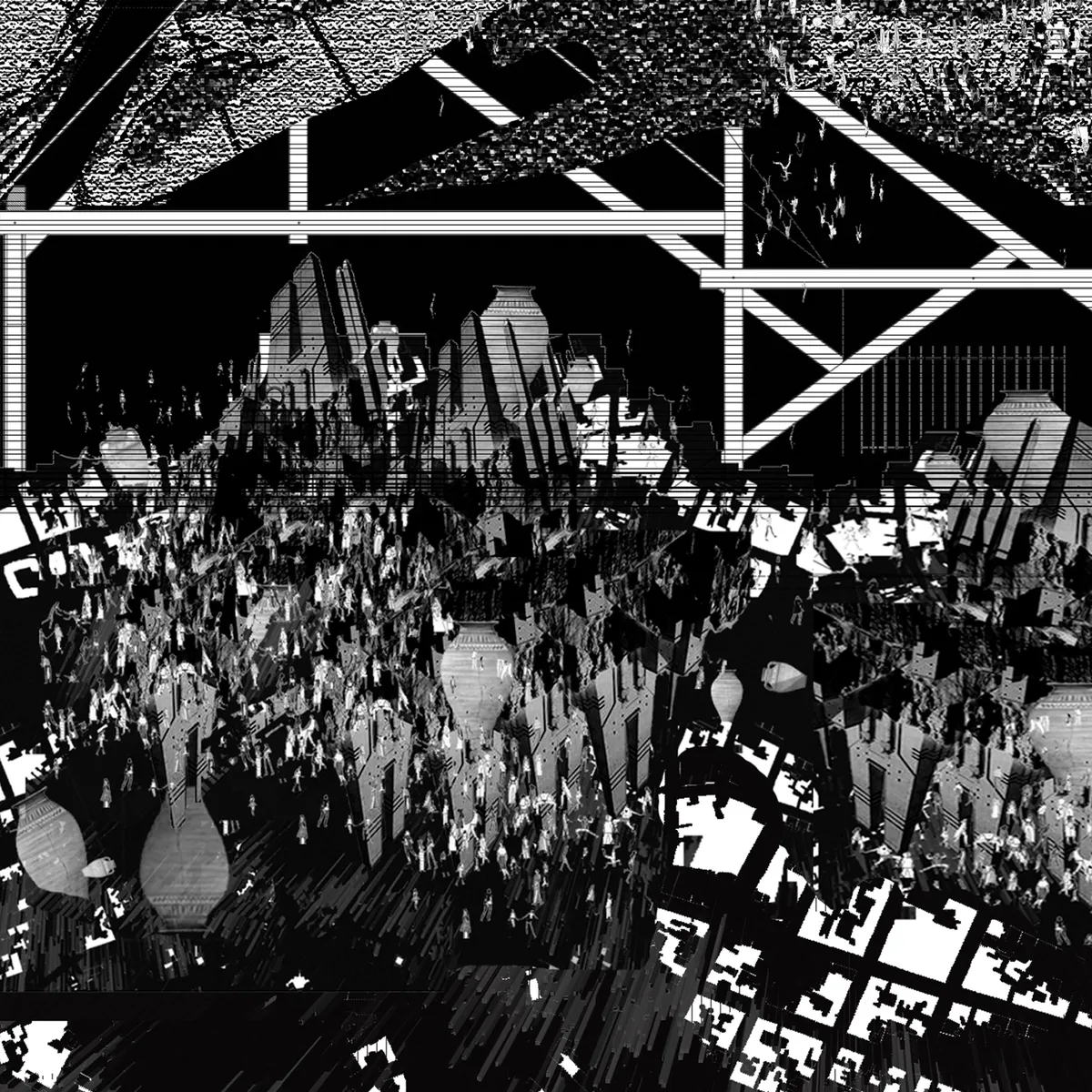 The given geometry, understood as the initial record of the design process—the double layer located in the third (from this space, the invisible layer), which is the facade of this historically significant object—suggested that the architectural expression should be placed between the given scene and the future scenario. In other words, architecture and archeology were joined by phantasmagoria as a connecting methodological line. This approach made the exhibition a study between real structure and architectural theory.