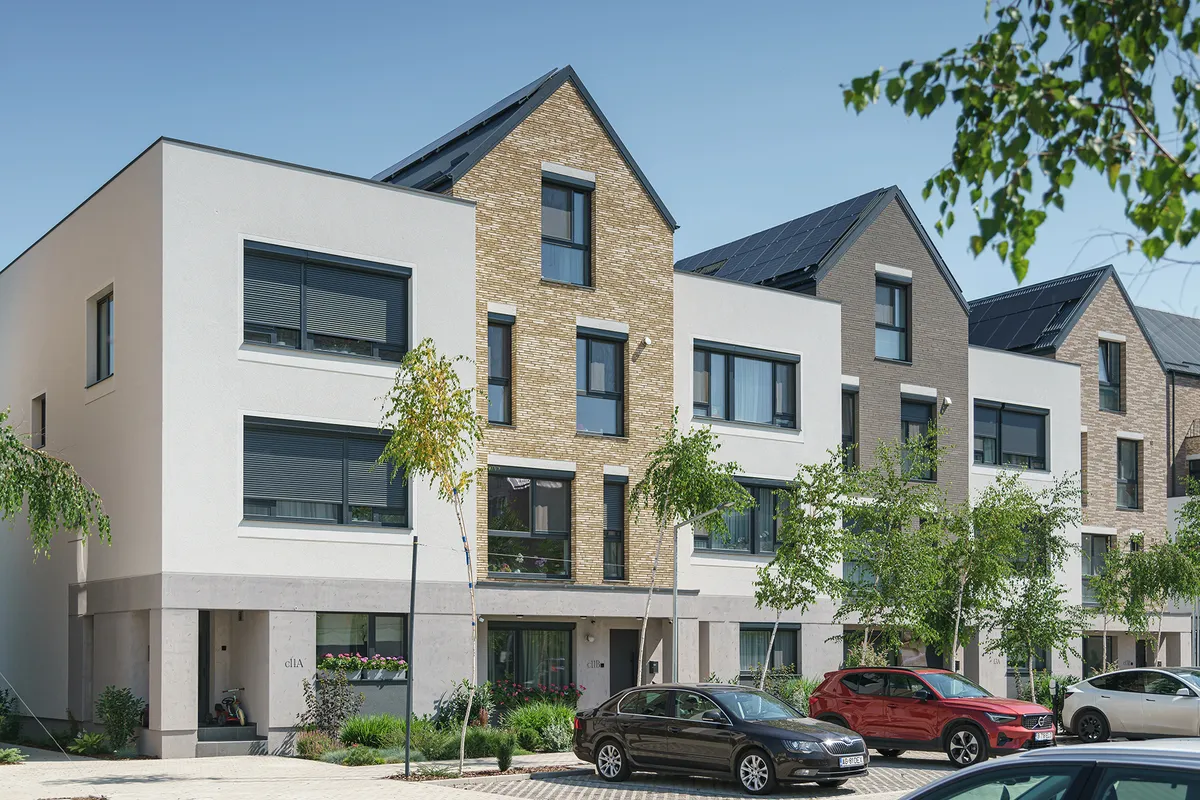 Being constrained to work with a simplified architectural language, basic details, easily procurable materials, and easy-to-implement techniques, we aimed to compensate through a high degree of formal variation within the residential complex and a pleasant urban atmosphere, inviting outdoor spaces to become part of everyday life. Thus, the complex incorporates playgrounds for children, community lawns, water features, wide promenades, façade gardens, and private yards and terraces, which, due to the intimate scale of the neighborhood, are already filled by groups of neighbors.