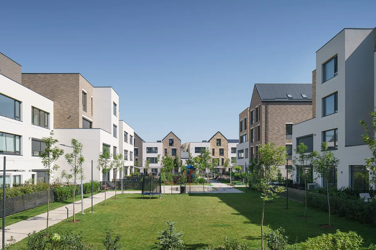 The project spans a lot of 20,072 square meters and consists of a mix of collective and individual housing modules, totaling 140 units and 250 square meters of commercial space.