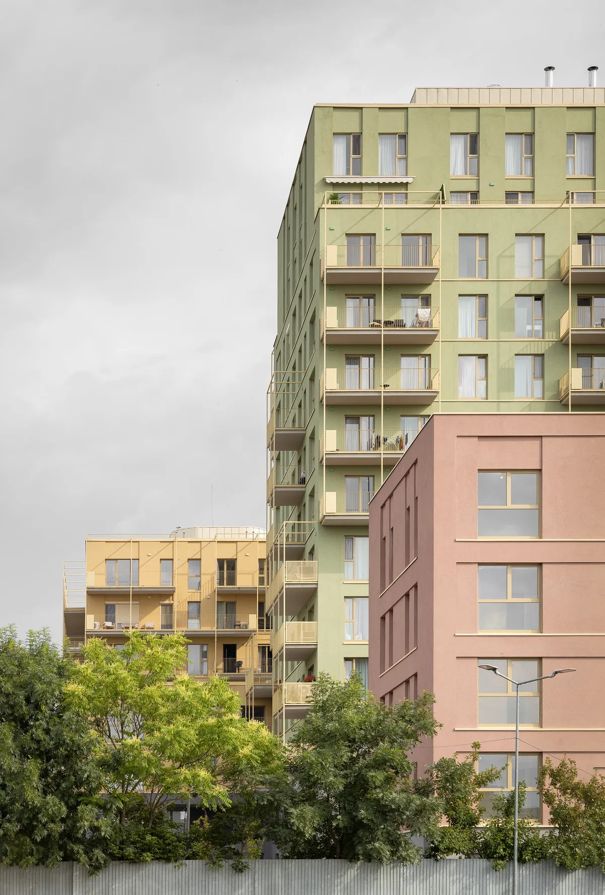 The intervention emerges as a generative response to structure within a disorganized urban context and consists of a compound of enclosed buildings formed by four perimeter-placed structures on the resulting land. This frees up the central zone of the site, transforming it into a space accessible to the public, partially planted - an elevated communal courtyard above street level. Opposite, along the newly created street, a lamellar construction is positioned, an integral part of the ensemble.