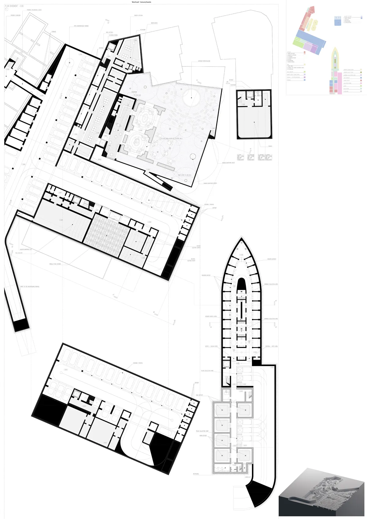 The building is placed on the site in such a way as to create a frontage with the blocks, while at the same time obstructing the numerous calcans on the site. The geometry of the site makes such a spine a good fit in this location, it also acts as a barrier to the blocks. The organization of the building is made around this spine, this central (containing) element, in which the circulation and some of the servic spaces are located.
