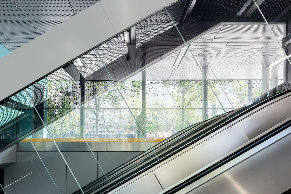 The architecture is transparent on the facades of the surface pavilion with a green roof. Freed from the layers of papundek that had been deposited on it over the decades, the building connects Podmaniczky Square with Bajcsy-Zsilinszky Street as a covered-open space, and by joining the series of prominent green cassettes surrounding the square, it protects the interior of the square together with them. The hustle and bustle and the quietness can both be experienced in the environment that has been renewed as a tree-lined promenade. Carrying the association of wind-blown leaves, the fine, generative graphic pattern that runs along the new glass facades and wall surfaces of the underground station reflects on this urban oasis. The colors and graphic surfaces promote the connection between the underground world and the surface, and resonate from afar to the poem of the namesake János Arany, famous Hungarian poet: "so homely here!"
