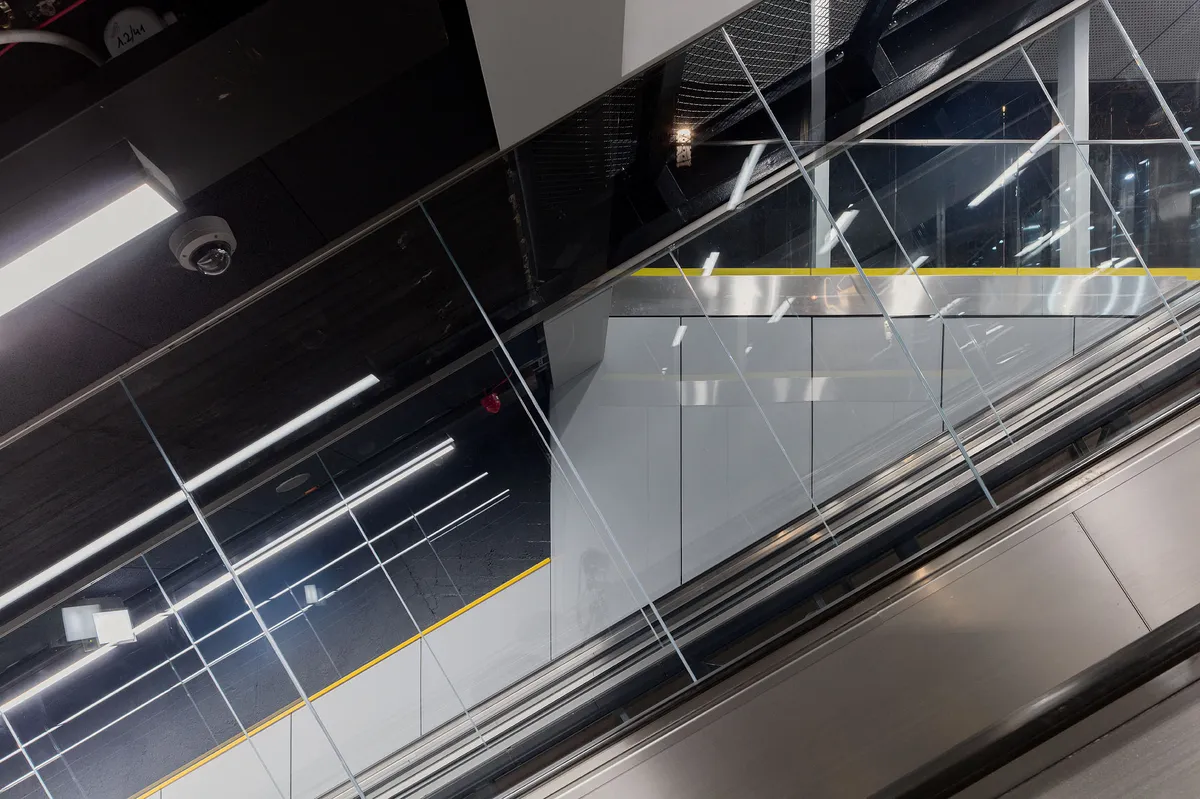 At the Budapest M3 Arany János utca station, the metro shows itself to the city: from the eight-story depth, we arrive not in a pedestrian underpass, but directly on the surface, in the pavilion building on Podmaniczky Square. One of the formulaic, so-called Budapest-type stations of the M3 line was originally characterized by experimental, yet restrained architecture in spaces with low ceilings. The comprehensive renovation refers back to this duality when it operates with contemporary elements. The inclined elevator inserted between the escalators stretches the available space, the slope is framed by stripped structures. The industrial atmosphere is present on the platform in a milder form.