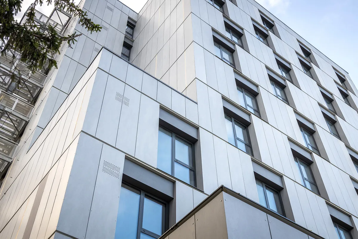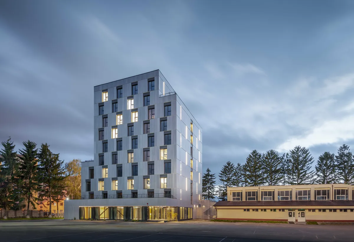 The design theme proposed to build a dormitory for the accommodation of students on the land of an existing vocational school. The presence of the school building and a sports hall, together with the irregular shape of the land, limited and conditioned the way the new construction was located. The building offers a ground floor with related functions (study rooms, medical office, restaurant) and 9 floors with 80 accommodation rooms, oriented east-west for the best possible natural lighting. The main design objectives were student comfort and energy efficiency to achieve nZEB standards. Thus, ventilated facades, green terraces with automatic irrigation system, solar panels, ventilation system with fresh air supply with heat recovery, LED lighting fixtures, controlled access system for each floor and for each room were proposed.