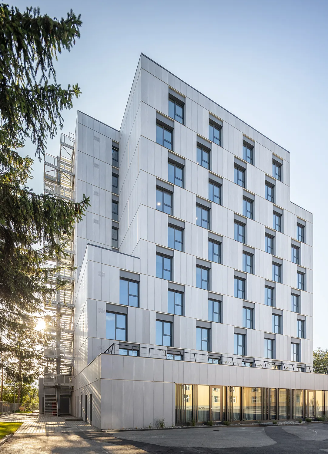 The volume is simple, compact, which, through successive retreats, dilutes its presence towards the upper floors. The modularity of the windows and fiber cement panels transforms the facade into a single generalized textured pattern, potentiated on the north and south facades by the facade lighting system.