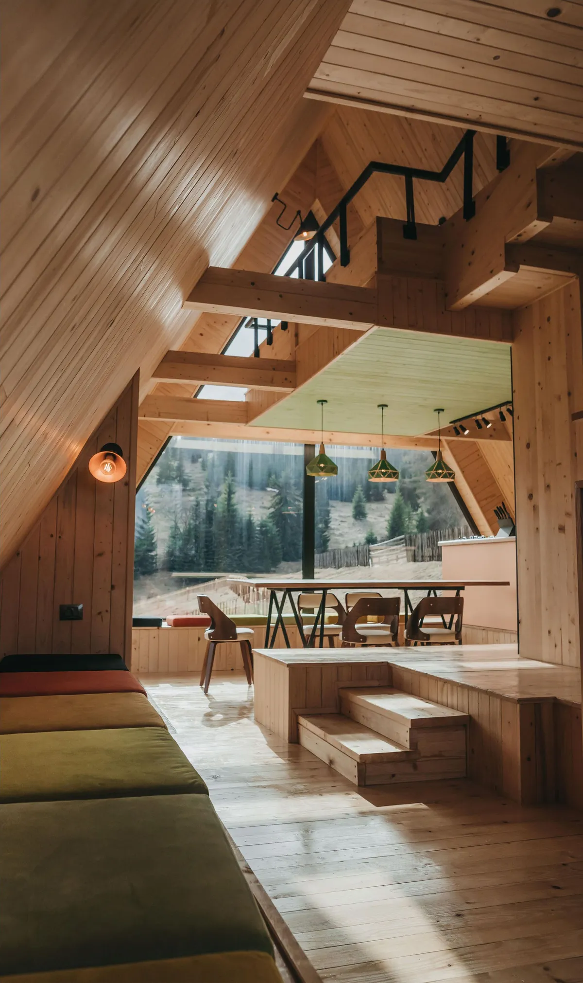 The interior spaces honestly highlight the wood structure, emphasizing it with exposed beams and paneling (some colored), interior joinery, but also enhancing it with black metal and copper. The exterior surfaces are treated in gray tones - exposed concrete and ceramic tile - outlined by colored accents in the wood and copper shades. Natural materials will age with the house, being in continuous transformation from season to season, from year to year.