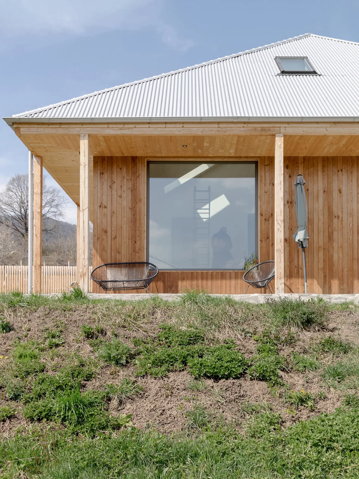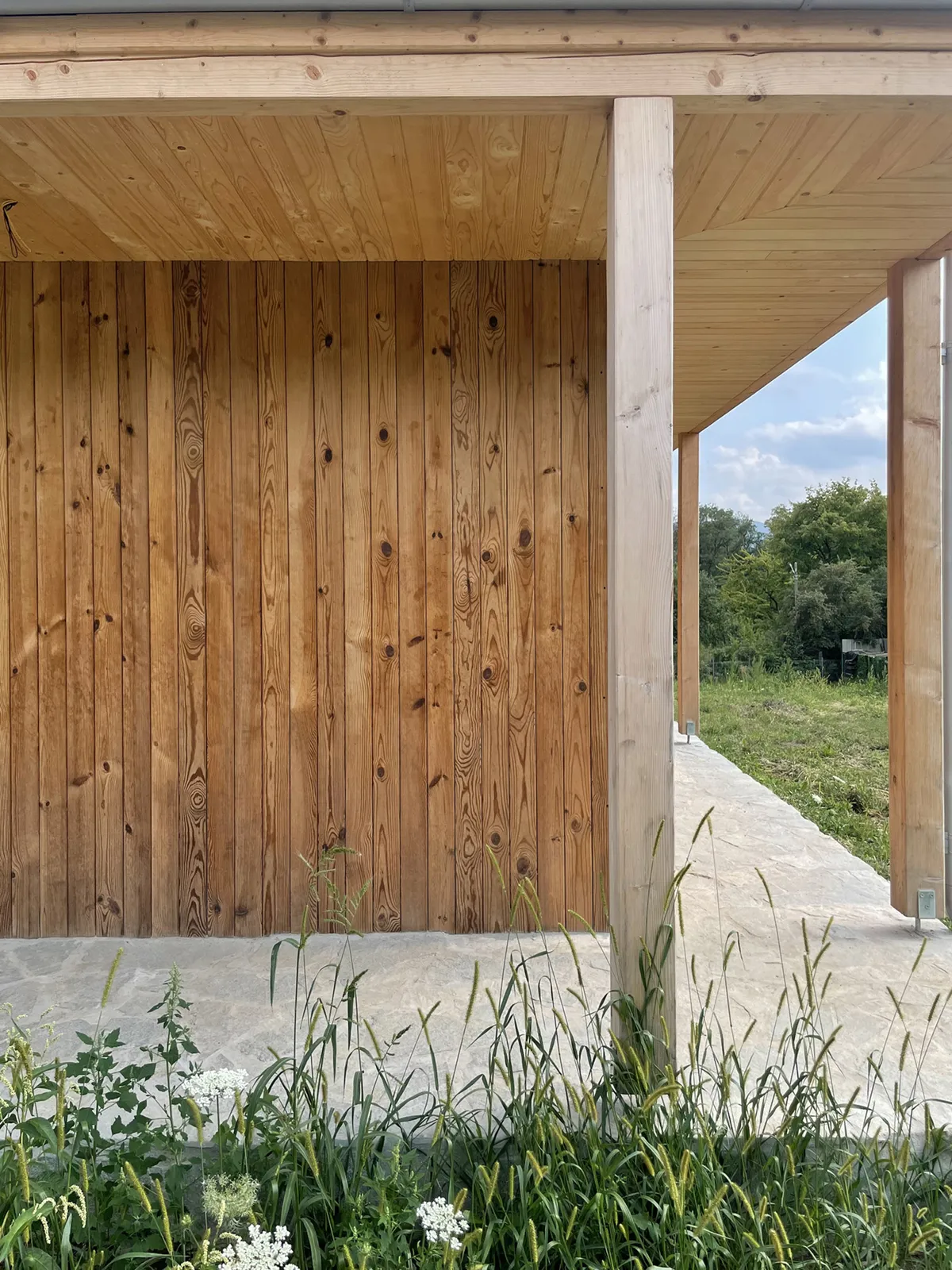 The whole project is executed with local materials and teams. The superstructure is made of timbeframe, with an external finish of thermotreated pine (naturally aged) and outlined by the regular structure of the veranda, with open corners.