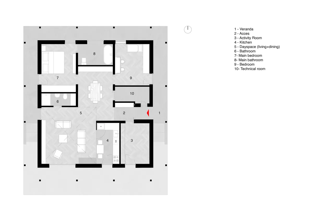 The general functional principle was a house without hallways, a woven, sculpted space, with the necessary functions oriented well towards the sun, but also ferrites from the neighbors. At the same time, in order to emphasize living on the ground floor, a perimeter veranda dissolves the strong boundary between the outside and the inside, offering additional protection to the facade against the weather and direct sunlight. Each space has level access, directly to the outside.
