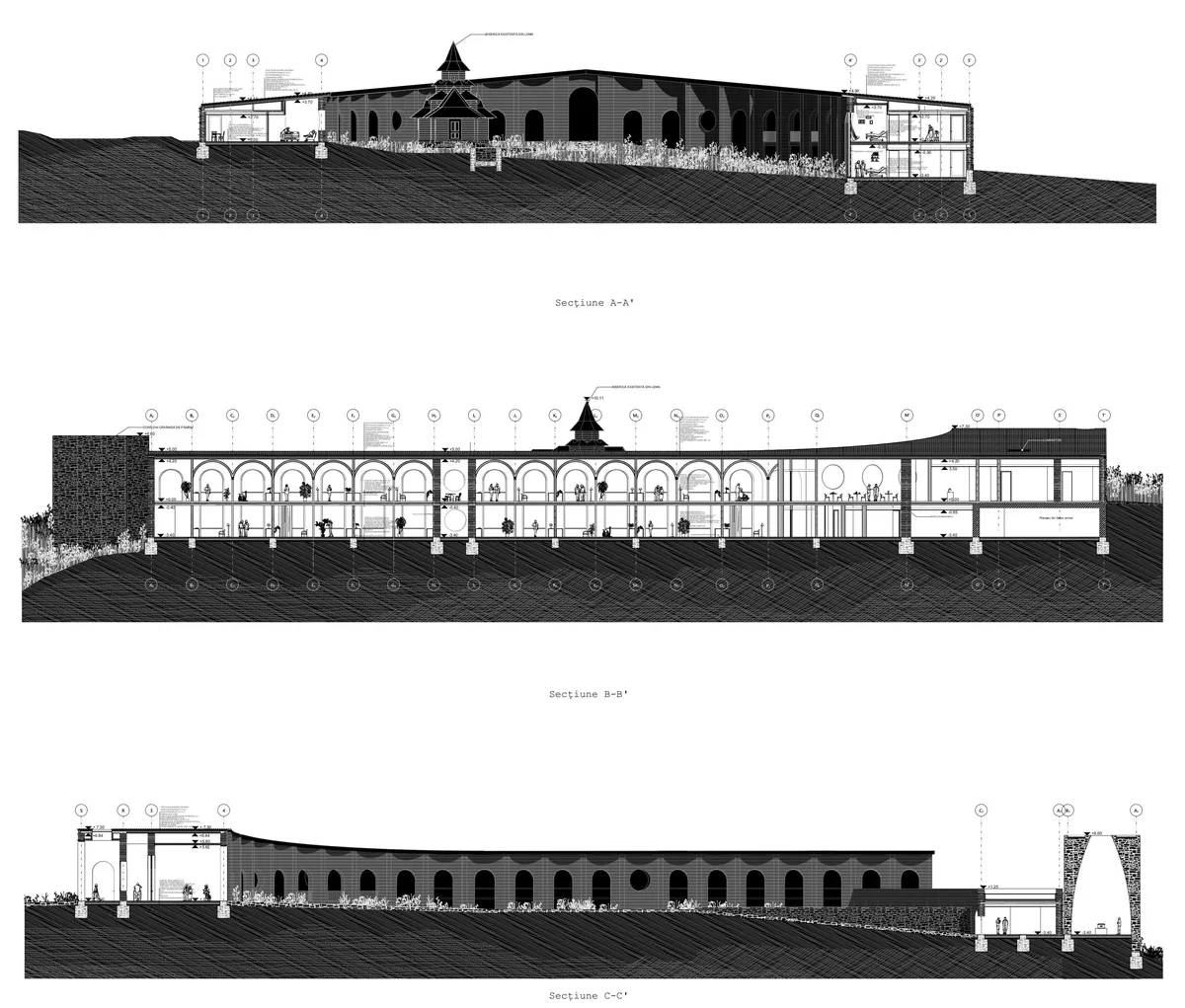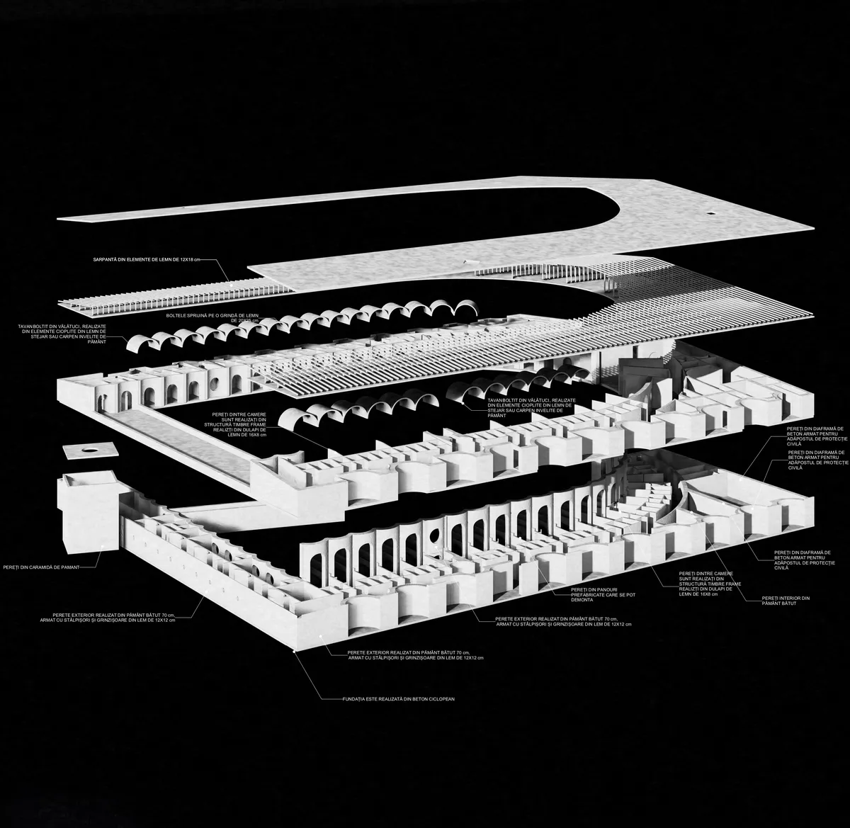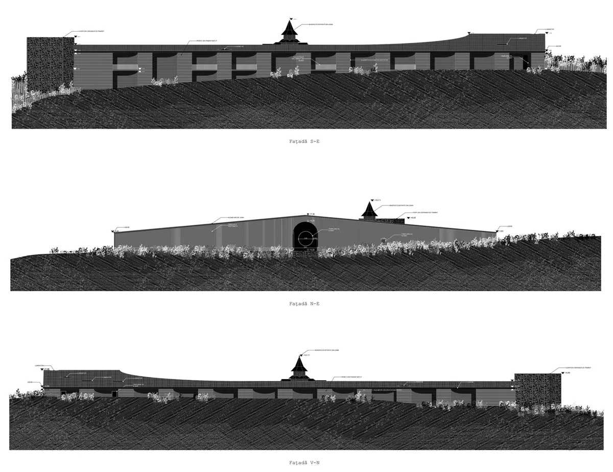 The proposed solution taps into this need for protection by taking the form of an enclave-like structure, resembling a defensive fortress. Despite its massive presence, it blends into the terrain's topography like a light mantle, offering both security and subtle camouflage within the natural landscape. The sacred space envisioned in the project pierces through the limits of this perimeter, like a bastion that provides a poignant setting for the solemn rituals surrounding life's final moments. It stands as a testament to reverence, marking the transition with dignity and respect.