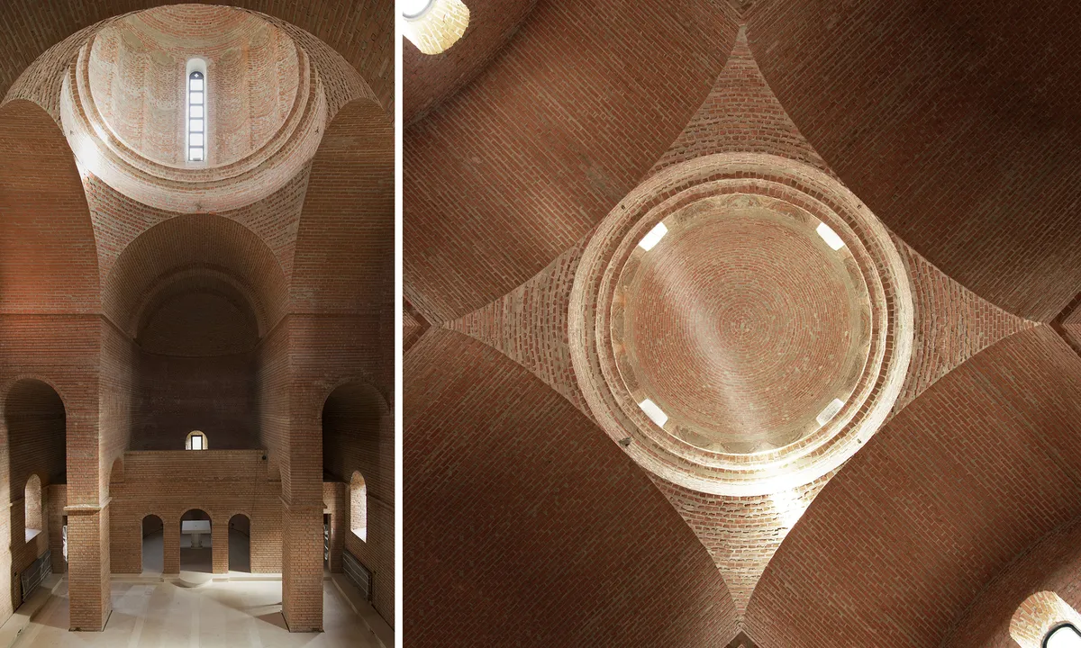 The church, the largest of the three buildings, with its white cladding on which the vibrancy of the thick solid brick walls can be glimpsed, is also the most open with its high porch. The church rests on ten cruciform pillars of exposed concrete, which define the Hall of Crosses – the public indoor space with the main role of meeting outside services hours, a setting for conferences, exhibitions as well as celebrations.