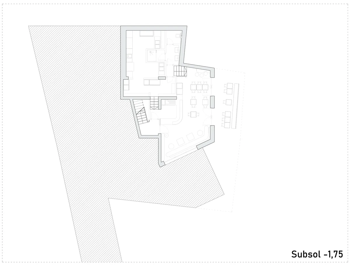 The southern sections are angled to conserve a tree and enhance functionality, guiding visitors from steps and multifunctional spaces to the bistro terrace in the basement. The design employs vertical differentiation of functional areas and offsets between them, using openings to enhance visual connections between rooms and the exterior.