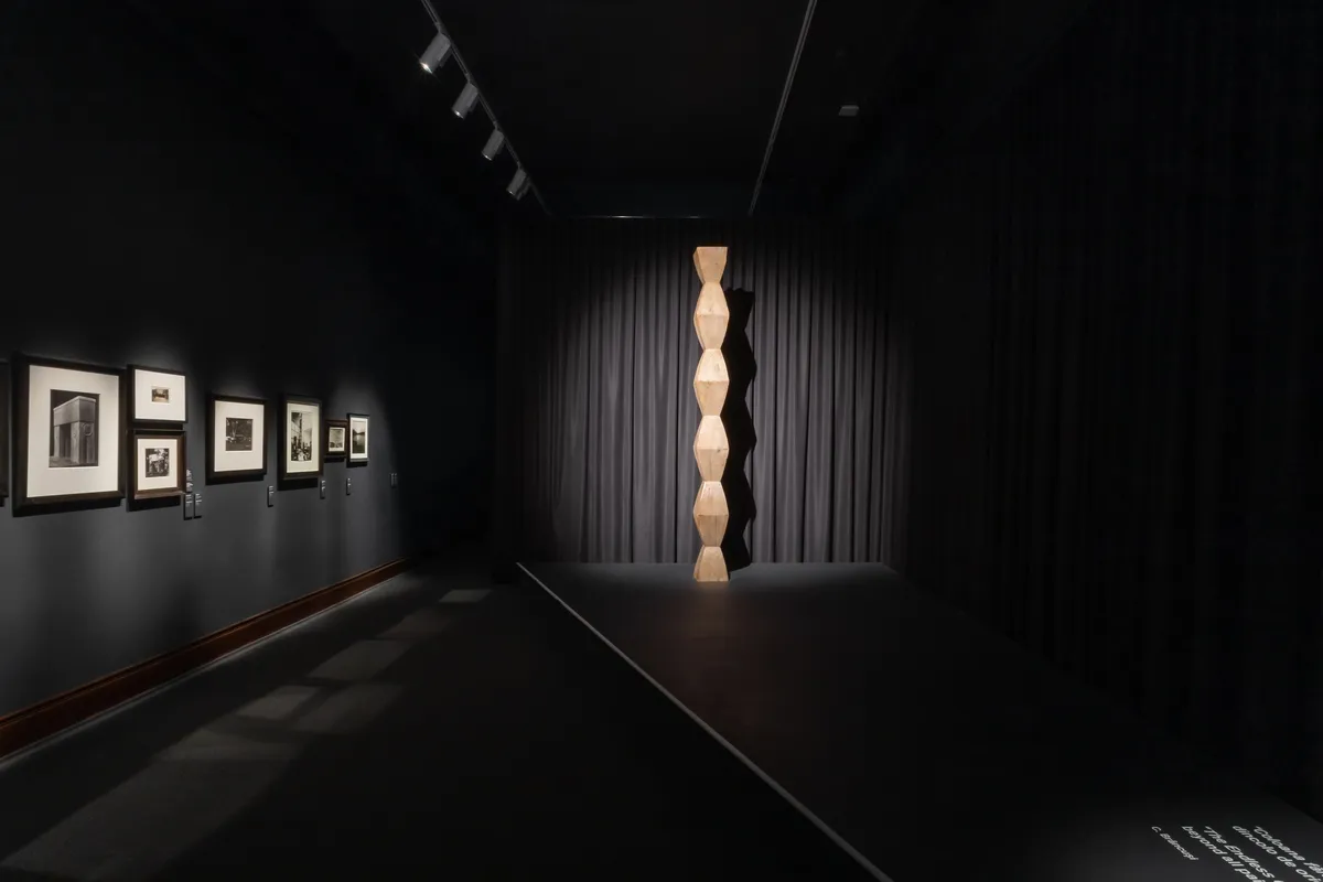 Together with the curator of the exhibition, Doina Lemny, the Brancusi expert from the Center Pompidou, it was decided to display the works in a new form, atypical for the artist's exhibitions so far. Since we are talking about a large number of photographs taken by Brancusi himself, depicting his works, it was important the way they were displayed but also their relationship with the sculptures. To transform this space, it was painted entirely black to absorb light, with areas of black curtains and the floor entirely covered in black carpet to absorb the sound, a different approach from the typical white cube spaces used in the past. Thus, the viewer is introduced into a dimension in which his senses are blurred. The spot lighting focused only on the work, as opposed to a general light, causes the rest of the visitors to be engulfed in darkness and emphasizes the visitor's connection with the artworks, creating a strong intimate connection.