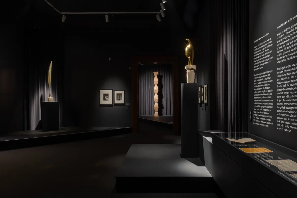 The architecture of the exhibition recreates the atmosphere of Brancusi's photography studio, which, by excluding natural light, tries to capture in his images the essence of his sculptures and to transfer all of the emotion to the viewer, cancelling any other disruptive element.