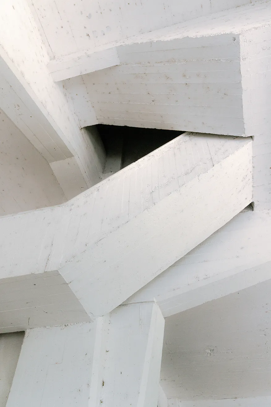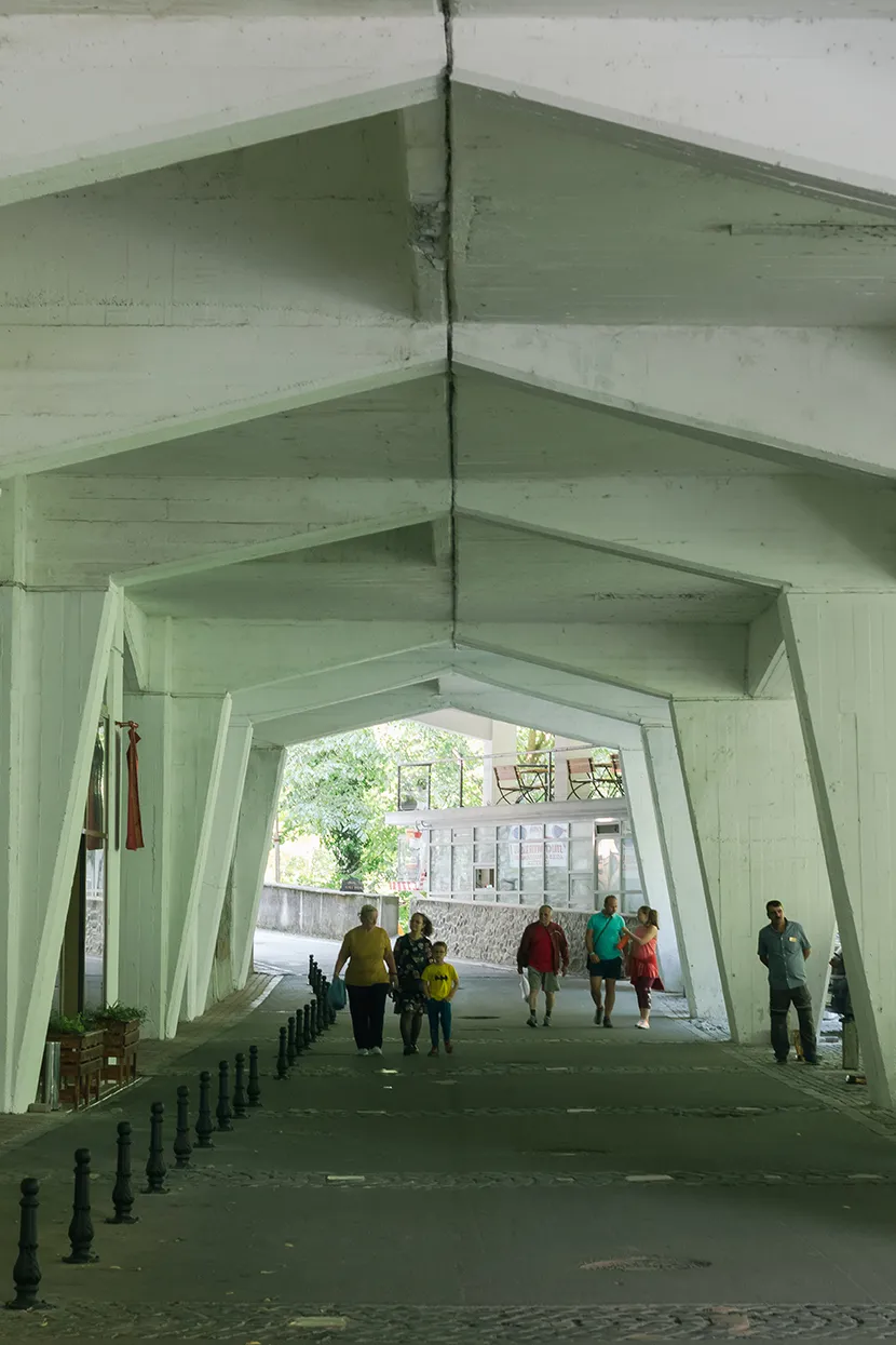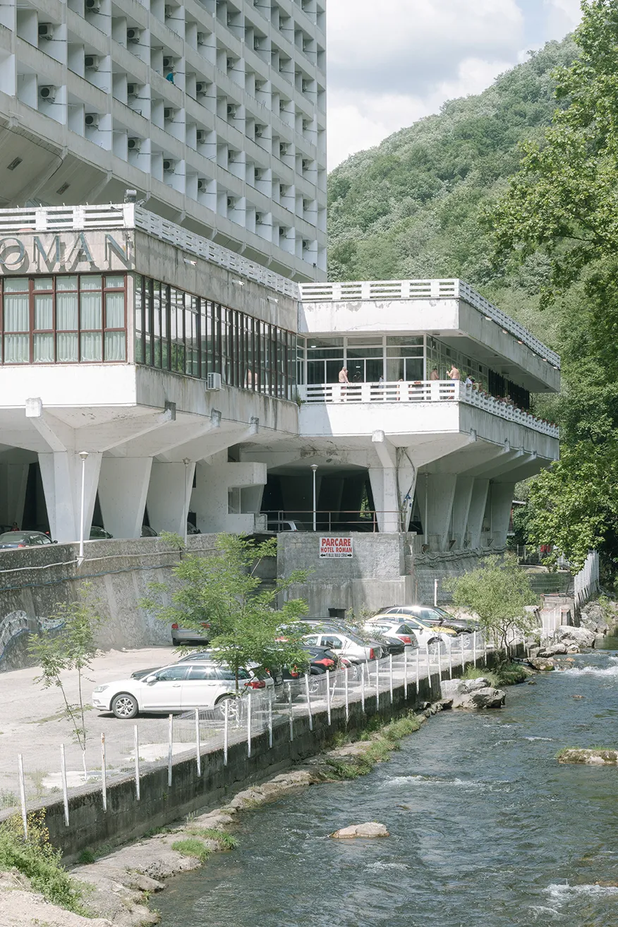 Deep in the valley of the River Cerna, between a mountain wall and the river, right on the edge of Herculane resort, lies an impressive piece of brutalist architecture - the Roman Hotel. Built between 1974-1976, the entire building stands on huge, sloping concrete pillars, which also cover and protect the main entrance and a few parkins spots. Underneath, you can only catch a glimpse of the beautiful scenery of trees and rocks. The sound of running water nearby reinforces the feeling of being in a cave somewhere. Little light comes through in this dark, rocky, cold, concrete place. The architecture, composed of clean, geometric lines, all clad in white stucco, contrasts strongly with the surroundings and at the same time reflects the existing colors of the rocks and vegetation, creating a constantly changing atmosphere during the day. Tourists not only use this covered space to park their cars and enter the main lobby but also a gathering place, a place to socialize and enjoy a beer. No one seems to notice the giant mammoth towering mightily above them. Perhaps this is because it conveys a sense of