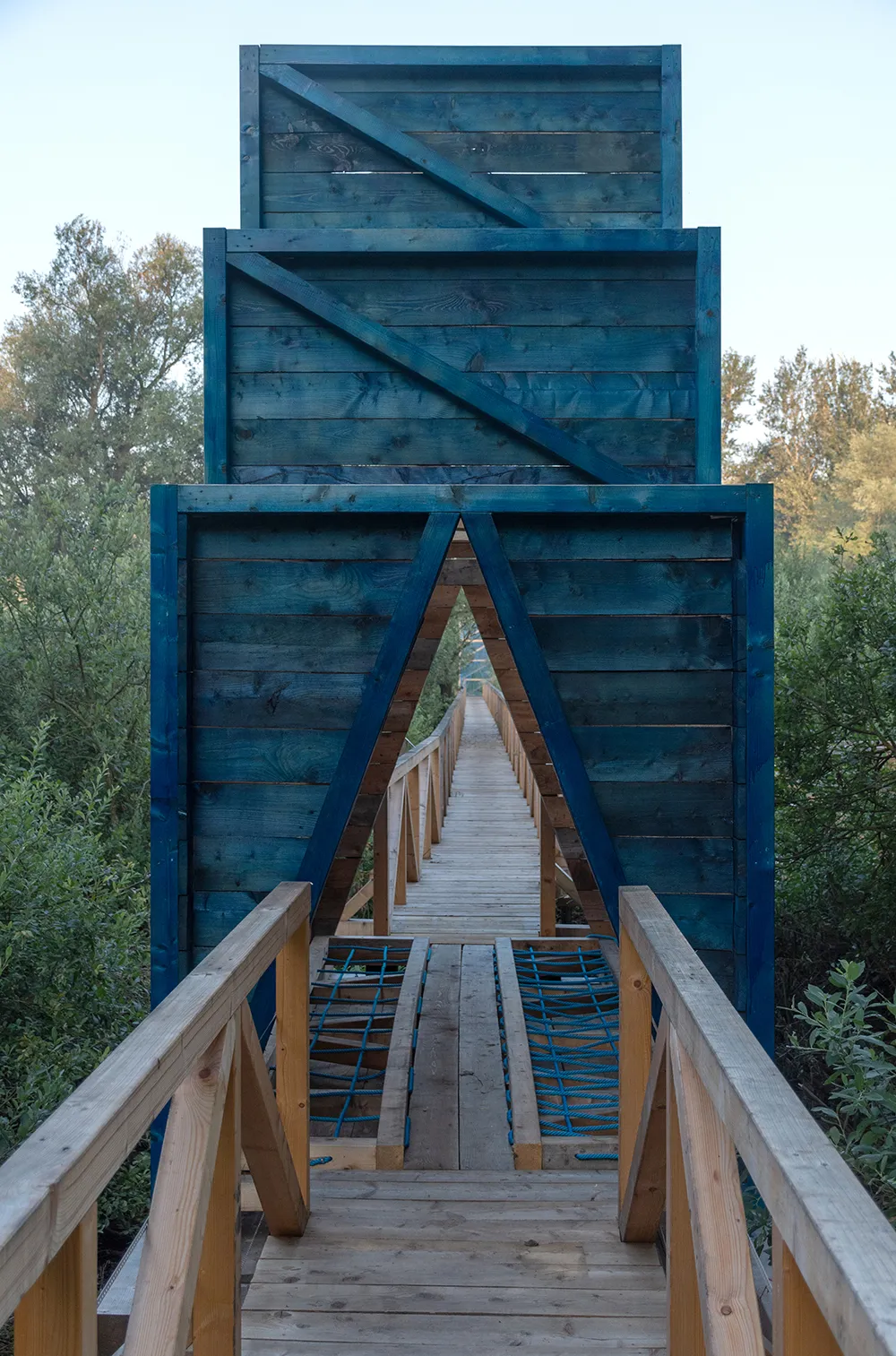 The blue pavilions, visible from a distance, appear artificial and unfamiliar in function at first glance. This design choice aims to create a sacred environment that, combined with educational content, provides visitors with a profound emotional and intellectual experience. The structures' significant blue color, rare in nature, further emphasizes the human touch, making it clear that they are man-made.