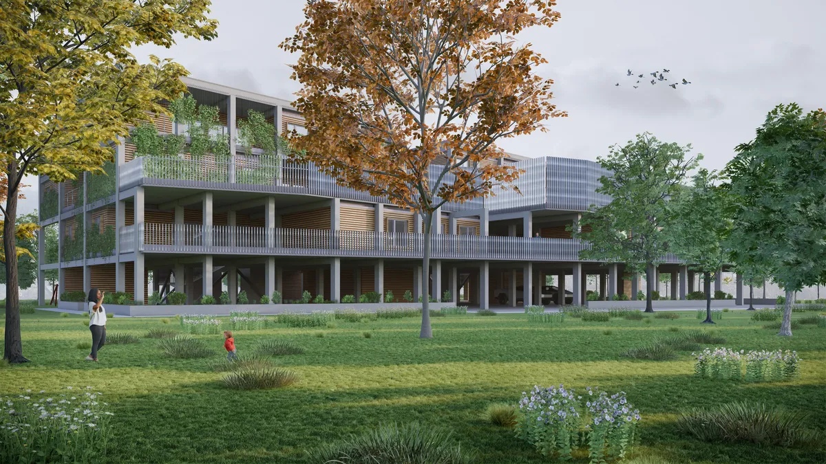 The apartments are arranged according to strict design rules, each connected to the building's mechanical shafts. However, their distribution gives a sense of randomness on the facade. The bottom level houses parking and mechanical rooms, allowing nature to flow under the elevated building. I avoided the most conventional infill wall solution, opting to retain the often “ugly” deemed frame as a visible surface. I felt it was my duty to show that these structures are not ugly, they just demand some care! The coexistence of the frame and new building structures create a unique appearance and a new chapter in the life of the lonely frame.