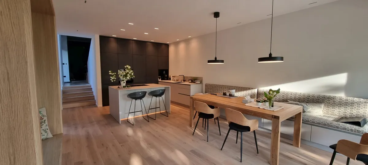 On the ground floor, in this area, you go down to the kitchen and dining area located a few steps below, at the same level as the garden, to which it is visually and functionally connected through several openings.