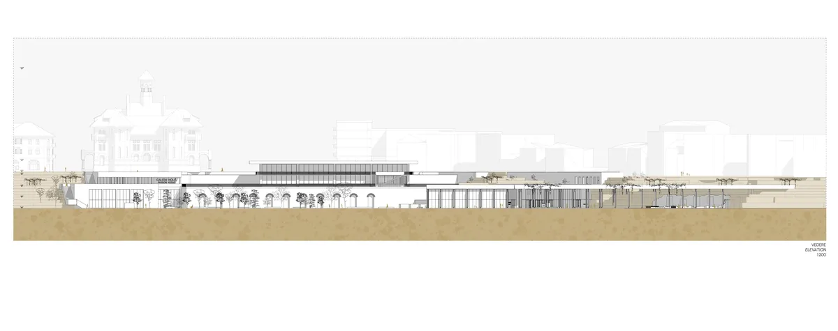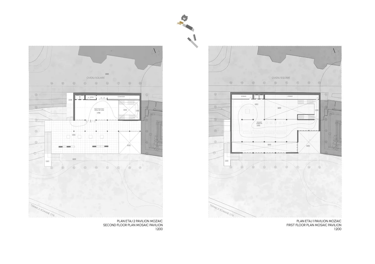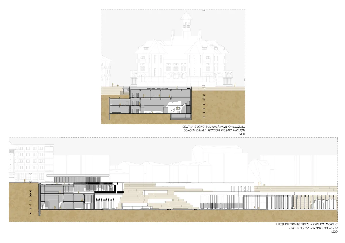 The purpose of the New Gallery is to reactivate the western slope of the Peninsula and to increase the interest in history and archaeology, thereby enhancing the cultural vitality of Constanța. The project expands the museum network in the city center and completes the pedestrian route. The ensemble consists of three pavilions: two developed along the cliff to consolidate the eroding slope and blend into the natural landscape, and a third volume extending from the ruins of the Roman Therme, which it protects and showcases. The Mosaic Pavilion, located next to the Roman Mosaic Edifice, houses the permanent treasury exhibition; the Ovidiu Pavilion includes halls for temporary exhibitions, a conference room, and workshops for visitors; and the Therme Pavilion contains the permanent exhibition dedicated to the Roman Therme and the objects discovered during construction. The materiality of the project—apparent pigmented concrete, metal, and glass—reflects the materials and colors found in neighboring buildings, such as the Roman Mosaic Edifice. These elements create a poetics of materiality, being juxtaposed, tectonic, and transparent. The pavilions are connected to the outside through buffer spaces, liminal spaces, porticos, patios, or urban pockets that facilitate the transition from indoor to outdoor space. The choice of this theme is motivated by the desire to sincronise Constanța's museums with international standards and to leverage the city's cultural and touristic potential