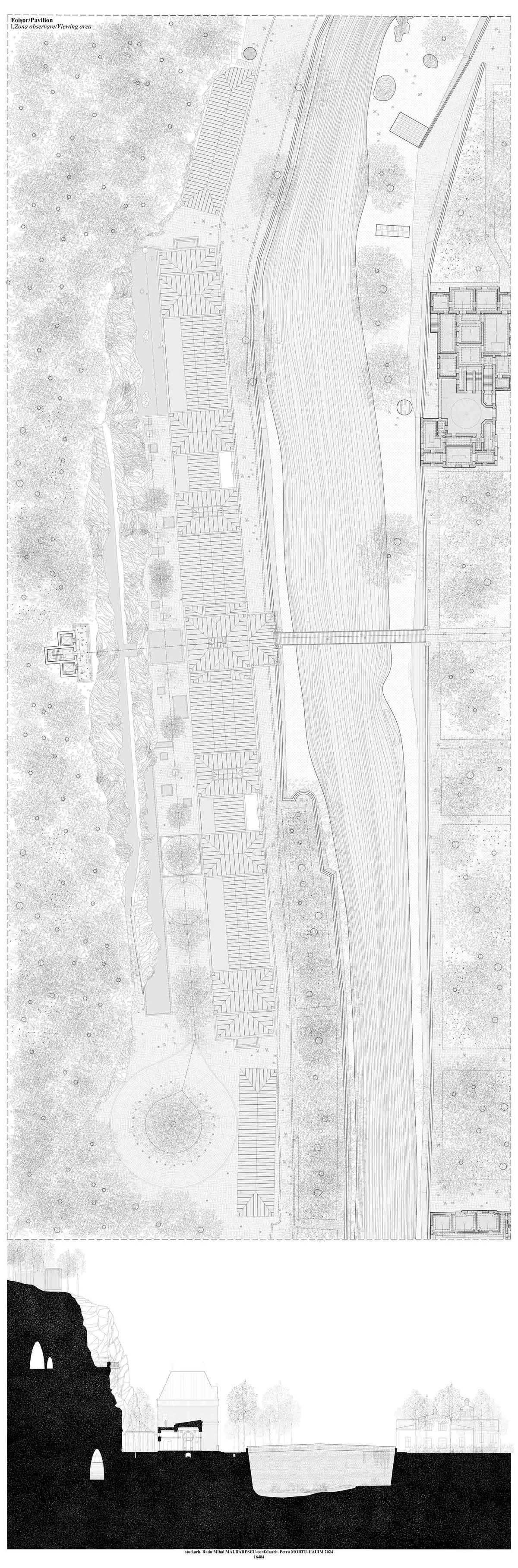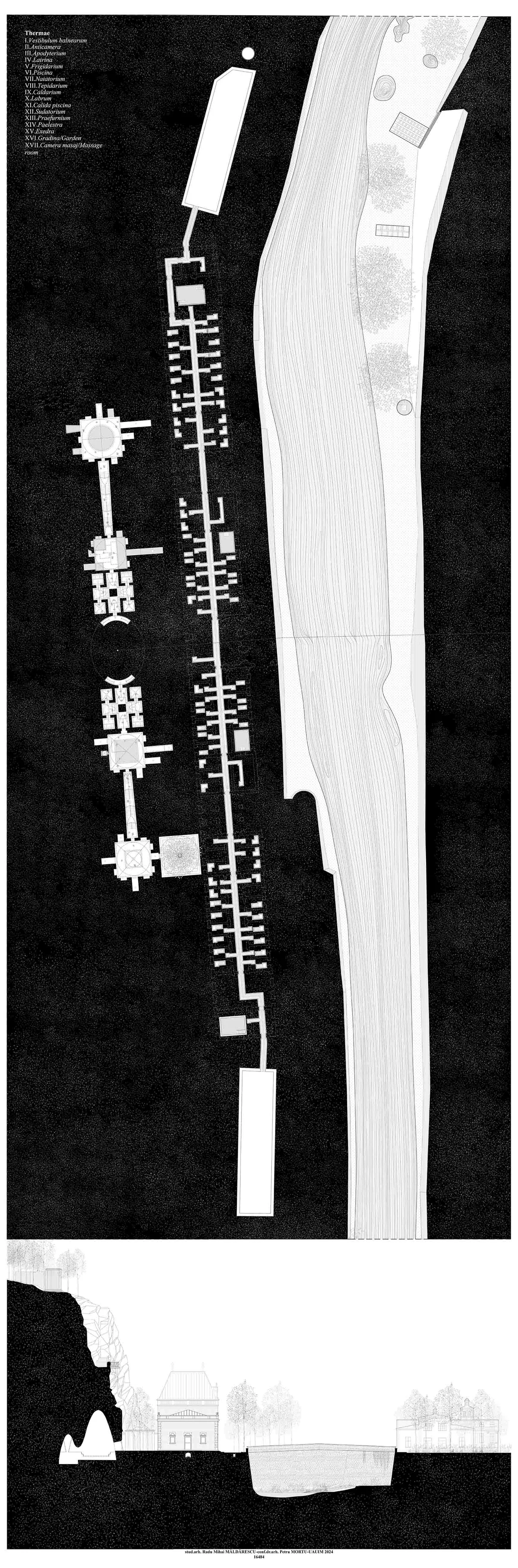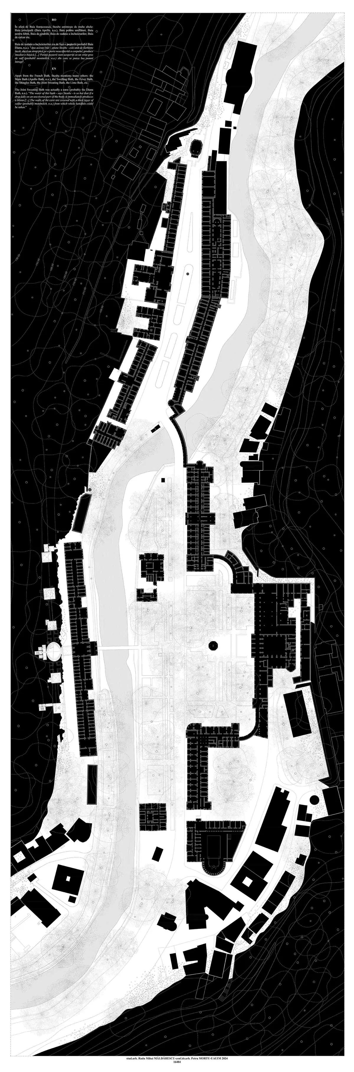 Local spa resorts are grappling with an outdated image of their cultural landscape and the inability of the built environment to relate to its surroundings. These shortcomings form the subject of the diploma project, which aims to restore the lost connections of the historic core and propose a scenario for regenerating the representative image of the Băile Herculane resort. The building of the former imperial baths is the focus of this project. Consequently, the intervention area is represented by the interstitial space between the object and it’s landscape, specifically the rocky cliff against which it’s silhouette is outlined. The solution employs two distinct procedures: subtraction and addition, ensuring that the relationship between the historic image of the baths and the intervention becomes complementary and maintains the character of the place. The interior spaces follow the structural rationales imposed by the environment of the intervention, resulting in distinct structural solutions for the room ceilings, yet in line with their functions. The objective of the intervention is to present contemporary architecture as an integrated part of the landscape and to raise awareness about the importance of architecture that cannot create visual unity without considering the specificities of its environment.