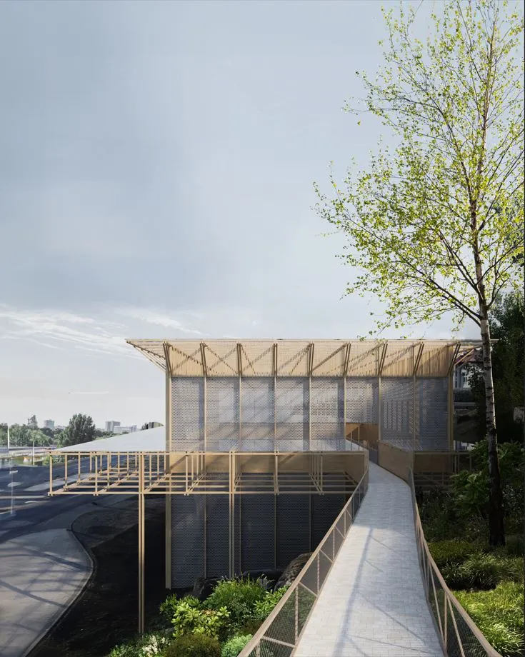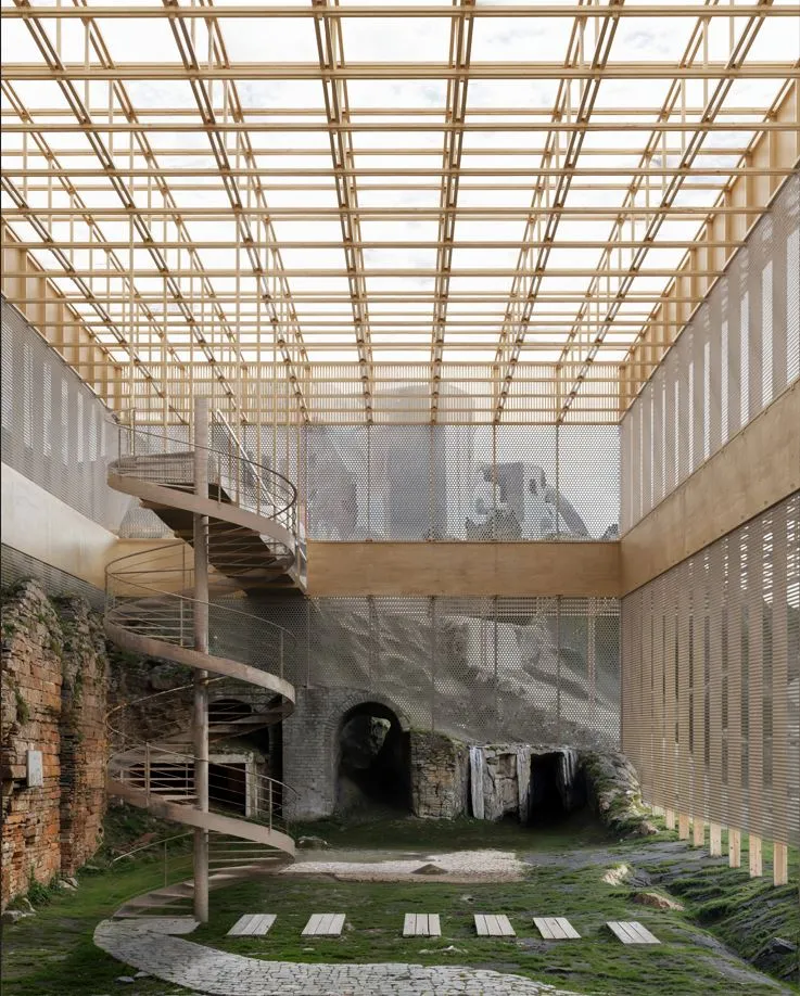 The protective structure for the Lentiarion ruins is made of laminated wood, easily demountable and extendable, allowing for future archaeological excavations in an area that has not been fully explored. The proposal is sustainable as it allows for passive ventilation and lighting. The visiting route is intuitive due to the stone paving that starts from the proposed construction.