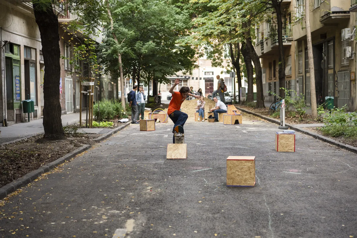 Playstreet?! took place in Barát Street, one of the former playstreets in Budapest, and in the pedestrian zone of Bauer Sándor Street. In collaboration with architect Alíz Bárczy and Építész Szakkolégium (EASA Hungary), Bogyó and Madácsi designed multifunctional wooden elements for these (temporary) car-free zones. These elements encouraged play for both children and adults without having a fixed purpose, thereby stimulating imagination. Before being installed, these structures were displayed at Kesztyűgyár Community Centre’s Gallery, where they served as pedestals and benches for a mini-exhibition on the history and potential of playstreets and children's urban play.