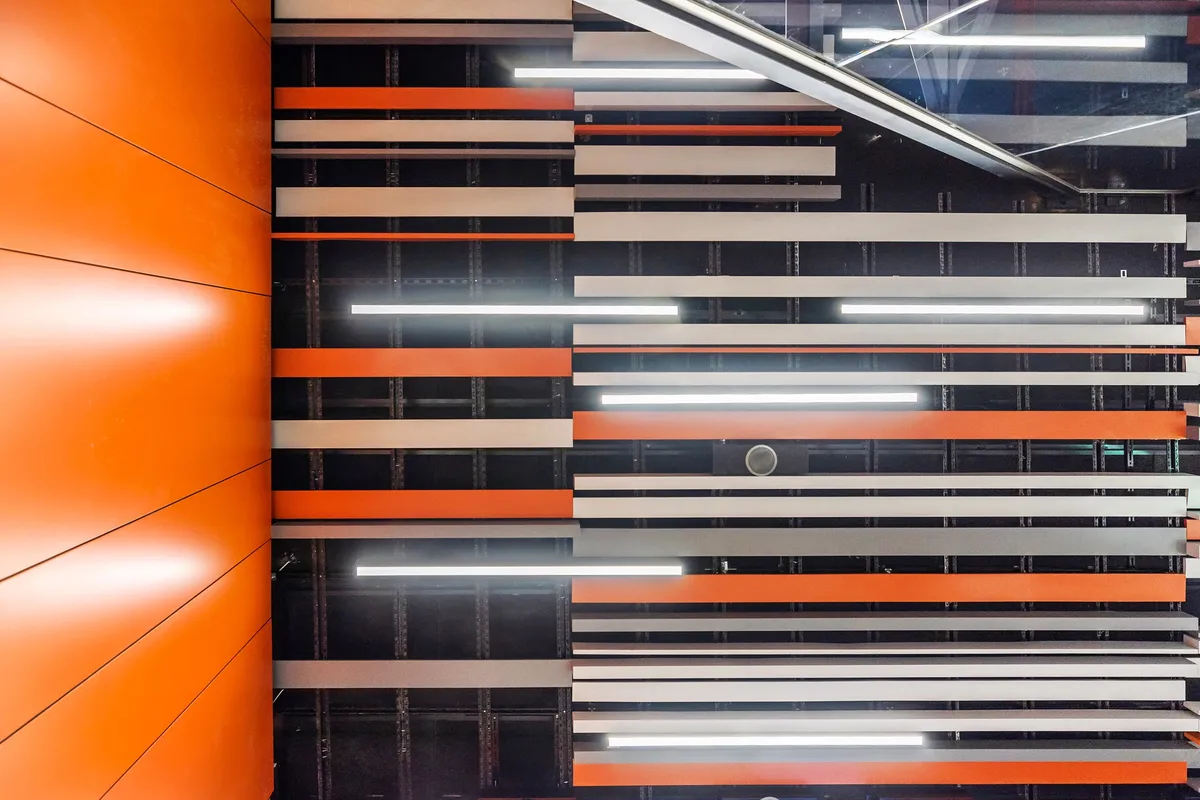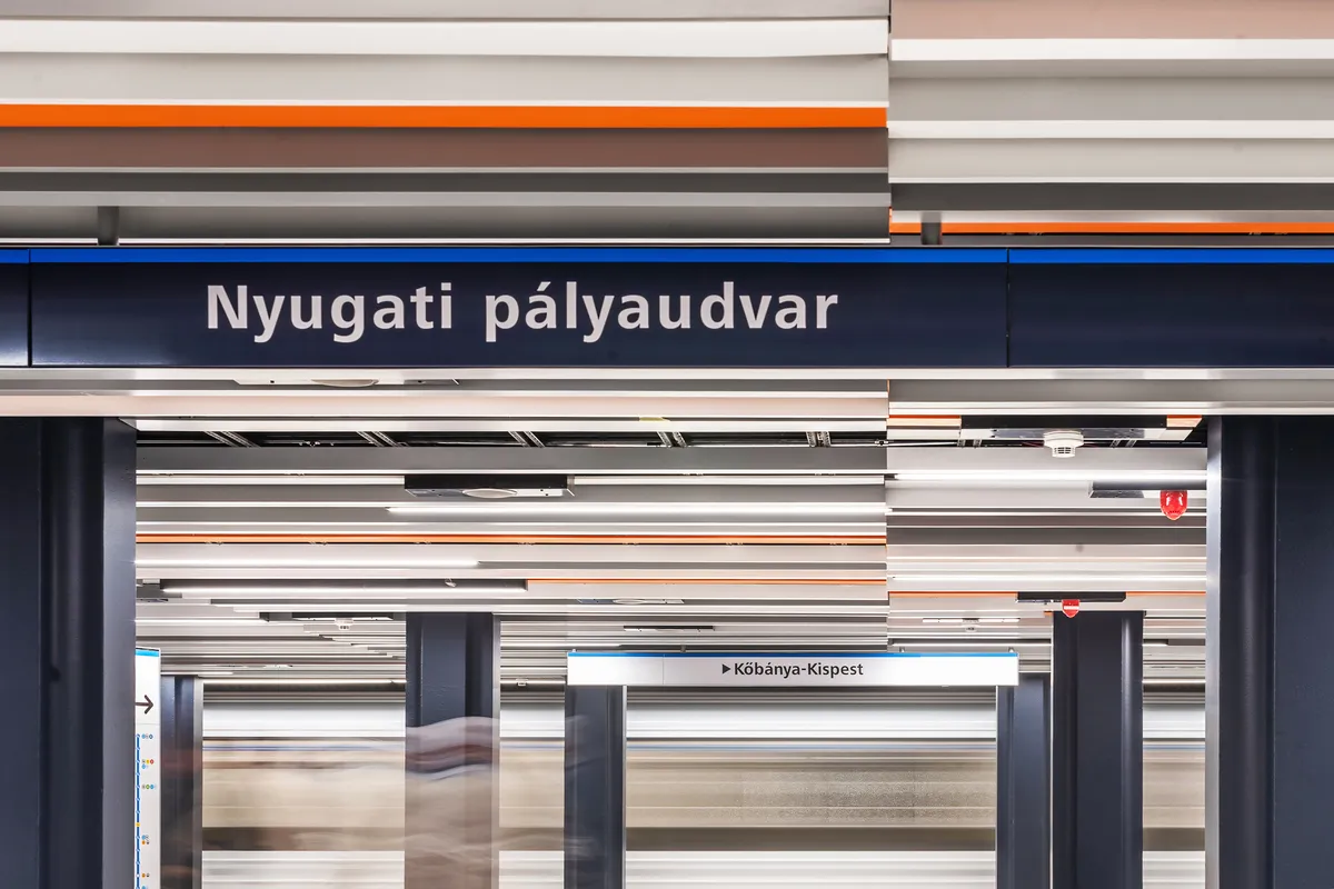 The reconstruction respects these elements, revealing and presenting the underlying structures, and reimagines the interior of the station. The original suspended ceiling's division was accentuated by the red luminaires distributed in a perpendicular pattern to the track; the proposed suspended ceiling recalls this division, but makes the surface transparent by the random, gaping placement of the lamellae. The distribution of the slats in the suspended ceiling is similar to that of the Corvin Square station, but here they are both set in the transverse grid of the station and in the colours (pastel red, light and darker grey) of the original row of lights. The red colour is thicker in the passenger concourse and thinner in the platform areas. The original red benches are replaced by pastel-coloured concrete benches, which are a transcription of the old benches in terms of shape and material. The (almost) Parisian blue, the trademark of the West, is returned to the walls as a metallic cladding with varying patterns. An inclined lift in the southern slope will ensure the station is barrier-free. Due to the space requirements of the elevator and the emphasis on the terraces, the slope will not be covered with the full surface, but will be presented in its "natural beauty", showing the difficult and complex construction technology of the station.