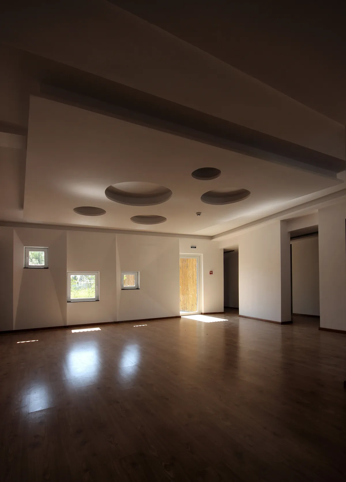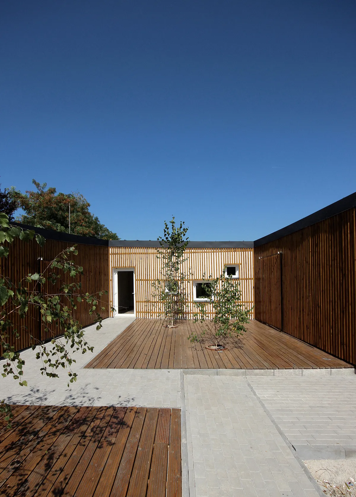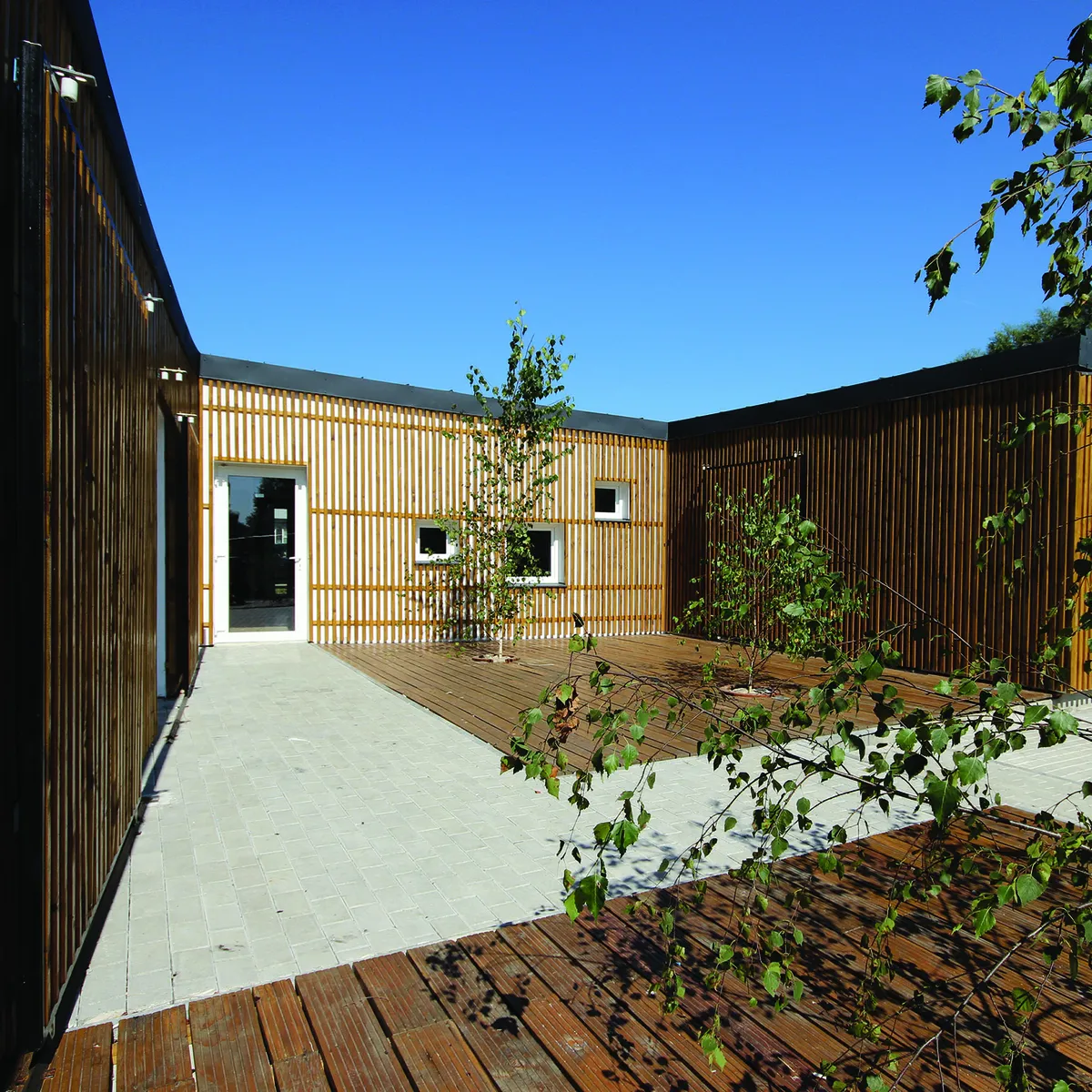 The kindergarten project in Oțelu Roșu, a decayed industrial town, illustrates this approach. The construction respects the land's topography and integrates harmoniously into the natural and social context. The front acts as a "wall" against the old apartment blocks without coherent refurbishments. The access through a symbolic "bridge" introduces children to a new world, reminiscent of characteristic "drawbridges," an element of transition into their world. The access space divides circulation towards the two wings for children's groups, protecting the common courtyard. Facades of wooden slats and generous windows create a warm, unified exterior, reflecting local rural architecture. Classrooms are protected by sliding slats, allowing the interior space to extend into the courtyard. The southern facade, with horizontal openings, ensures natural lighting. The anthracite metal roof, with asymmetric slopes, emphasizes integration into the natural landscape.
