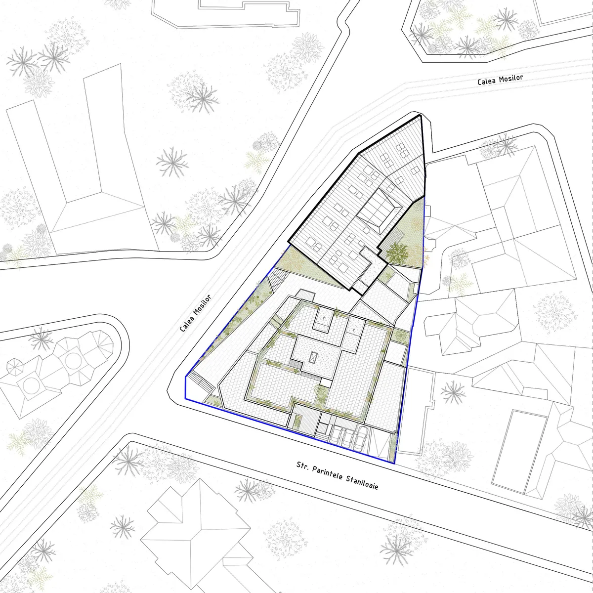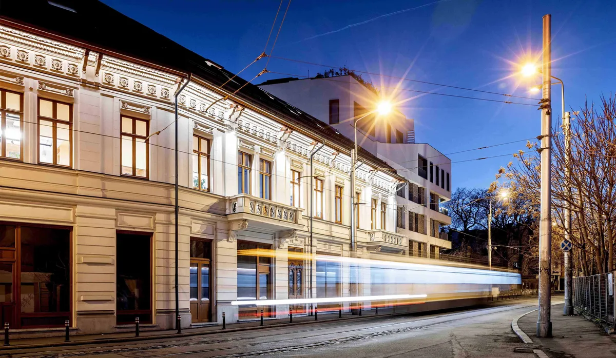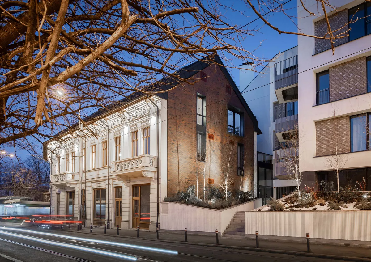 The old structure, a historic building from the 19th century, has undergone a complex restoration and extension process, transforming it into an office building adapted to contemporary requirements. The historical study highlights the connection between the construction of the building and the historic identity of Calea Moșilor, a former traditional commercial artery. The story of the residence began in 1895 when merchant Iancu Haratidis commissioned the project from Swiss architect John Elisee Berthet, according to "Authorization" No. 48/1 June 1895. The residence emerged during a period that defined the urban image of the pericentral areas, as aligned in the "plans of Bucharest" from 1873 and 1893.The Popp-Bunescu residence is just one of the projects by architect Jean Berthet; his portfolio includes examples such as the Macca house and the Grădișteanu - Ghica residence. The architecture of the building displays characteristic features of the eclectic style, combining Renaissance elements with neoclassical ones, typical of the mid-creation phase of modern architecture in Romania.In 2020, when the building and the adjacent plot were subject to intervention, the Haratidis House was in an advanced state of deterioration, having undergone a series of spontaneous modifications. The monument was restored, preserving the decorative and architectural elements. The wooden components of the roof and the joinery were reconstructed, and the original wooden staircase was rebuilt based on the model of the original one. The gables were transformed into architectural elements that connect with the exterior through the insertion of subtle reinterpretations in the form of bow windows. This approach, along with the preservation of brick as the original texture, also marks the contemporary identity of the monument.The conversion of the property into an office building respects the typological precedent of the commercial ground floor, with offices located on the first floor and the attic. Interventions in the attic transform this space from one that was unusable into a spectacular and creative area, featuring zenithal natural light and access to split levels. The approach to the exterior spaces aims to enrich the urban experience along Calea Moșilor.