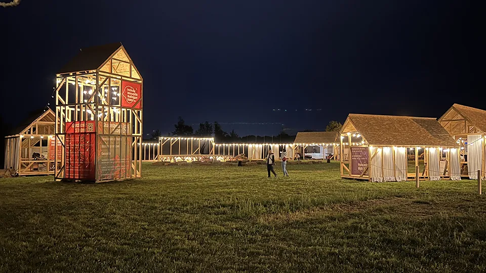 We have already proven our love for honesty, well, in the case of the Village, we tried not to hide its modernity. The ensemble had to shelter - against the sun, the wind, the rain, but also from the eye curious about the backstage stories. When it comes to closures, we've refused the gimmicks and didn't mind joining untreated wood with OSB, haberdashery cloth and plastic banners.