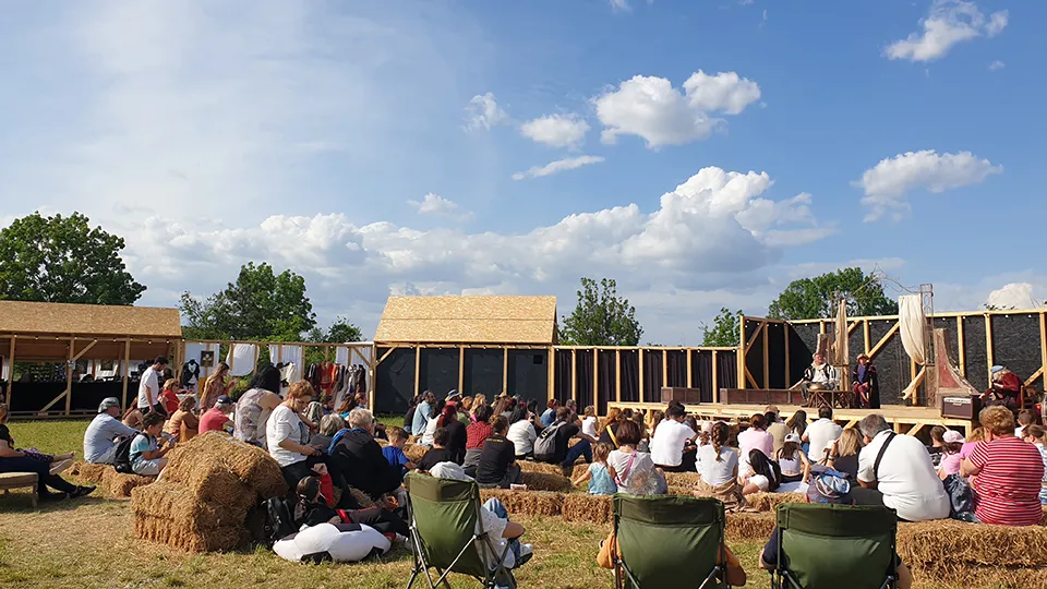 All we did was respond to the challenge of the festival with a simple and quick idea. Next to the large concert stage of the Park’s Hippodrome, the festival wanted a medieval-inspired space that would teleport visitors to the places and times of the playwright who gave it its name. Hence the circular precinct with perimeter boutiques, a signal tower, and the Elizabethan stage. Hence the structure of square beams made of raw wood in which the rhythmicity of the vertical elements and bracing also plays a role of decoration. Hence the references to The Globe and Tudor architecture.