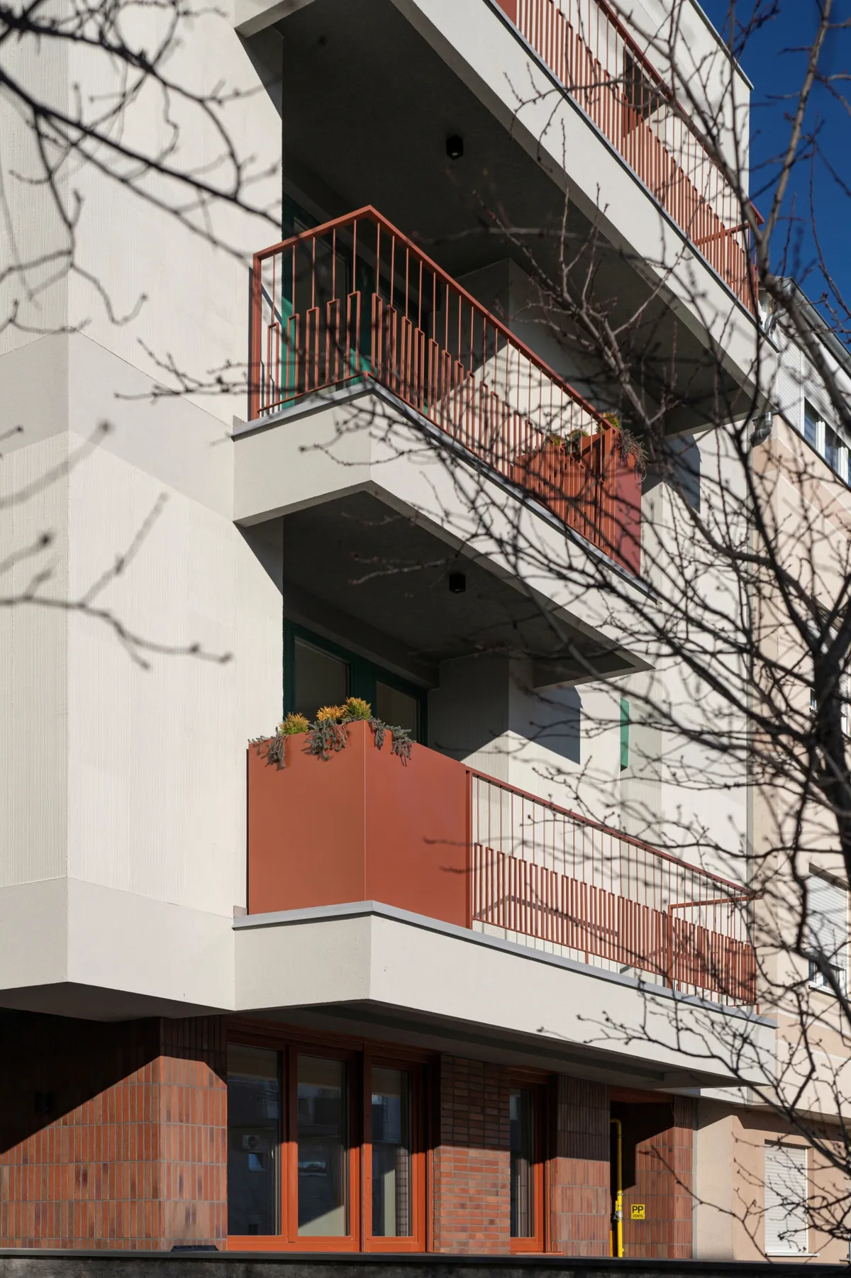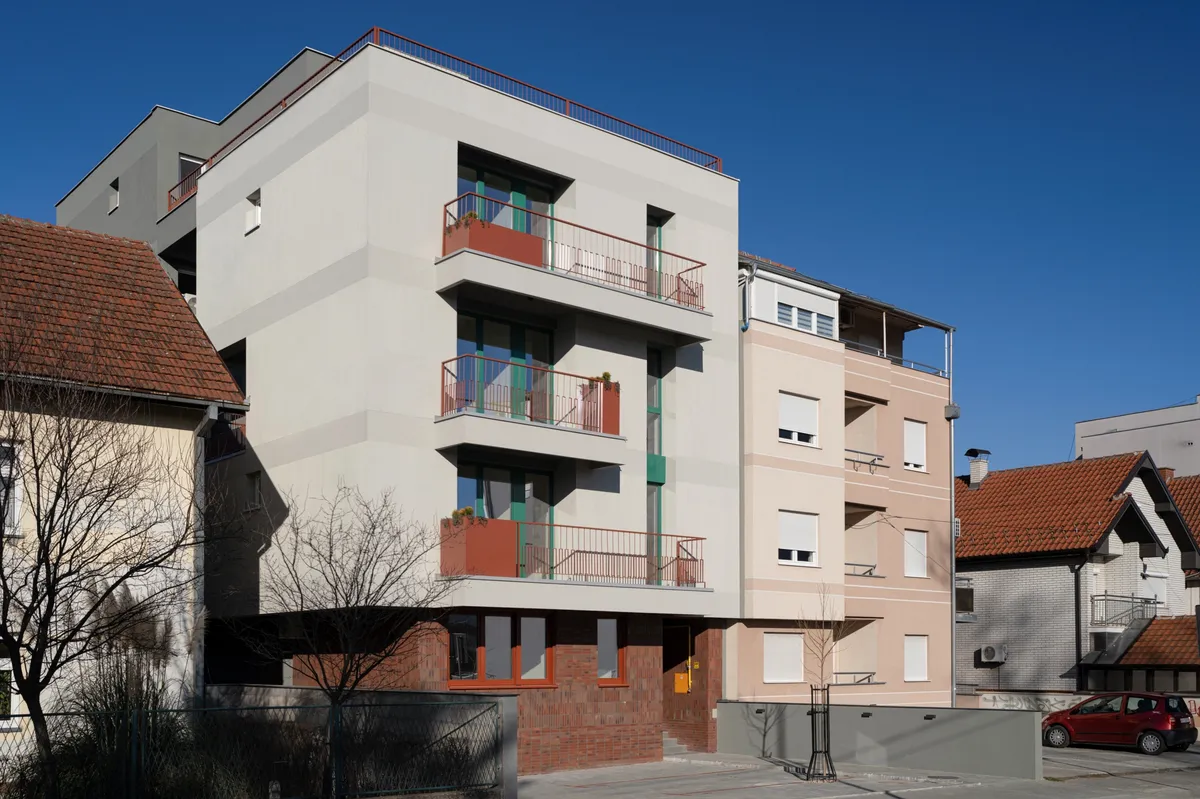 The roof terrace was conceived as a safe space away from the street, which would have the potential of a summer garden for organizing children's birthdays, celebrations and other social needs of the tenants, as an extension of the space of a compact apartment and compensation for the lack of a better organized yard due to the limited number of parking spaces.