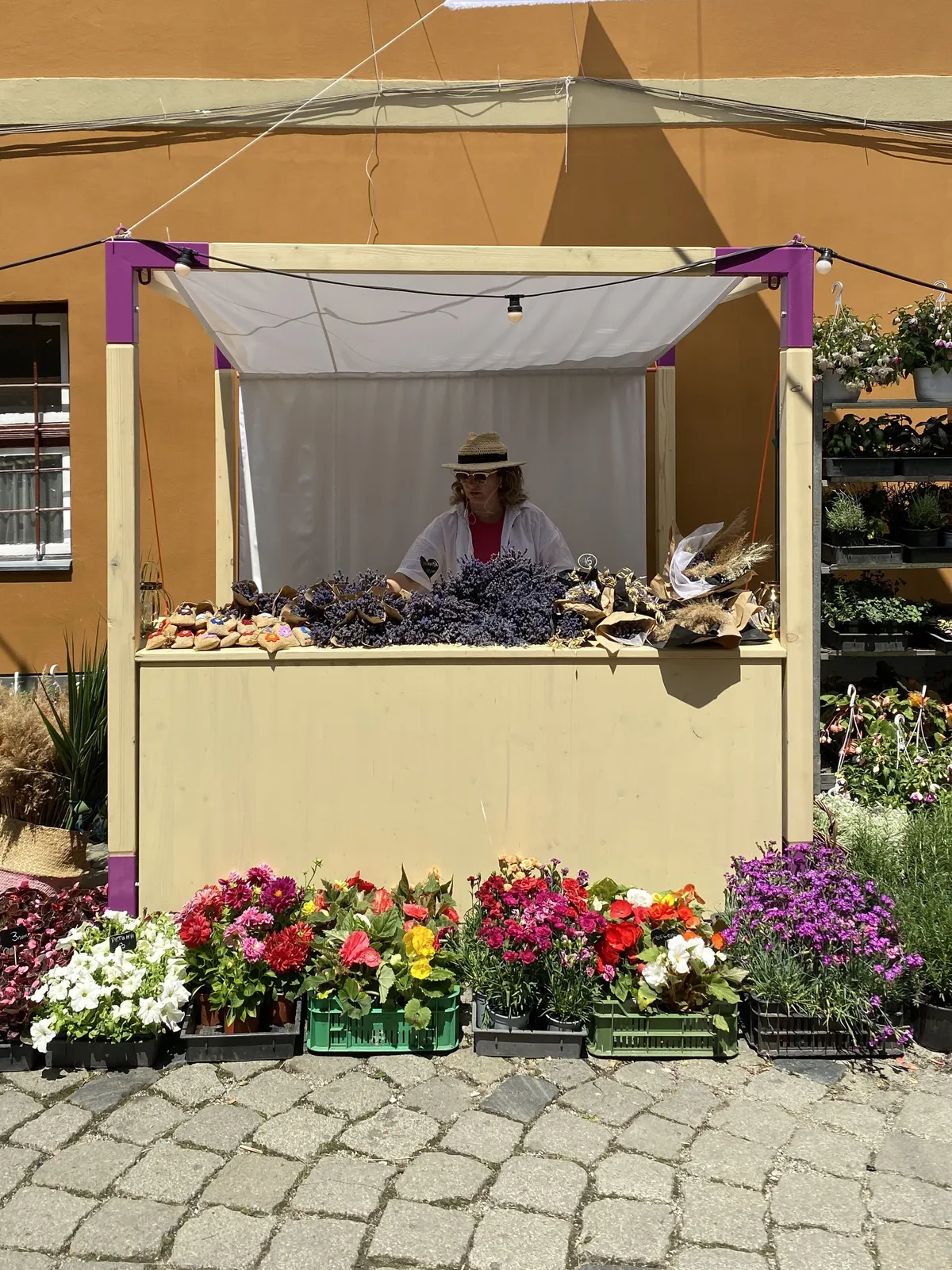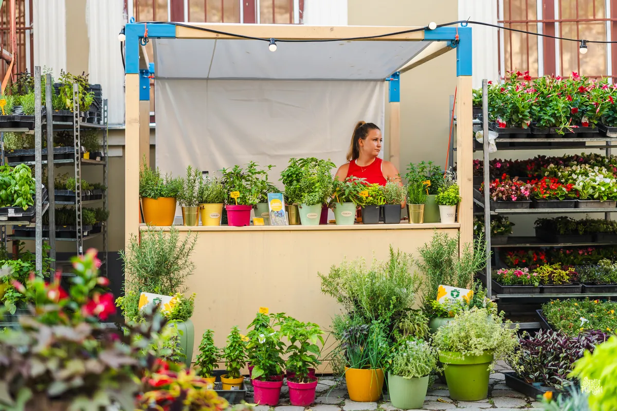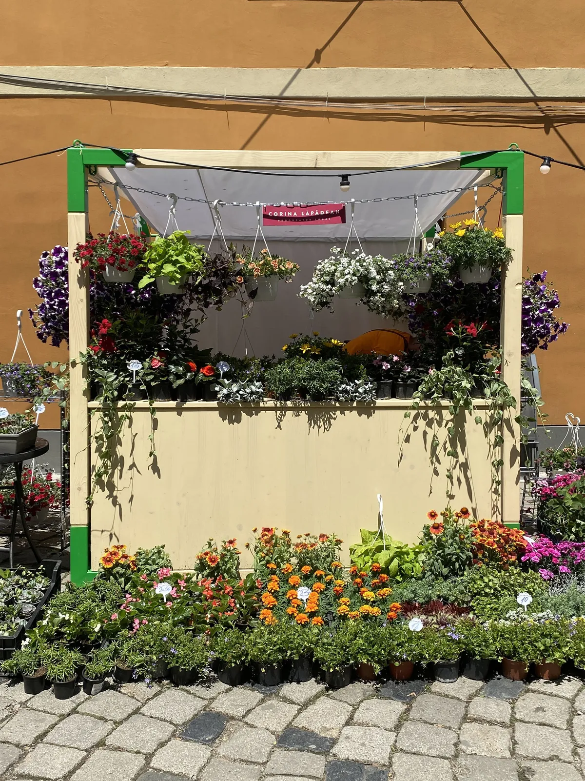 A multifunctional stand that primarily provides producers with a protected space to showcase their products. Initially designed as part of the flower festival on Potaissa Street in Cluj, the stand's ultimate purpose extends beyond this. Due to its modular construction, it can be easily assembled and disassembled, easily transported, and, most importantly, it can be developed into various types by extending in one or two directions. The metal corner pieces allow it to be expanded into a larger pavilion or transformed into an exhibition pavilion.