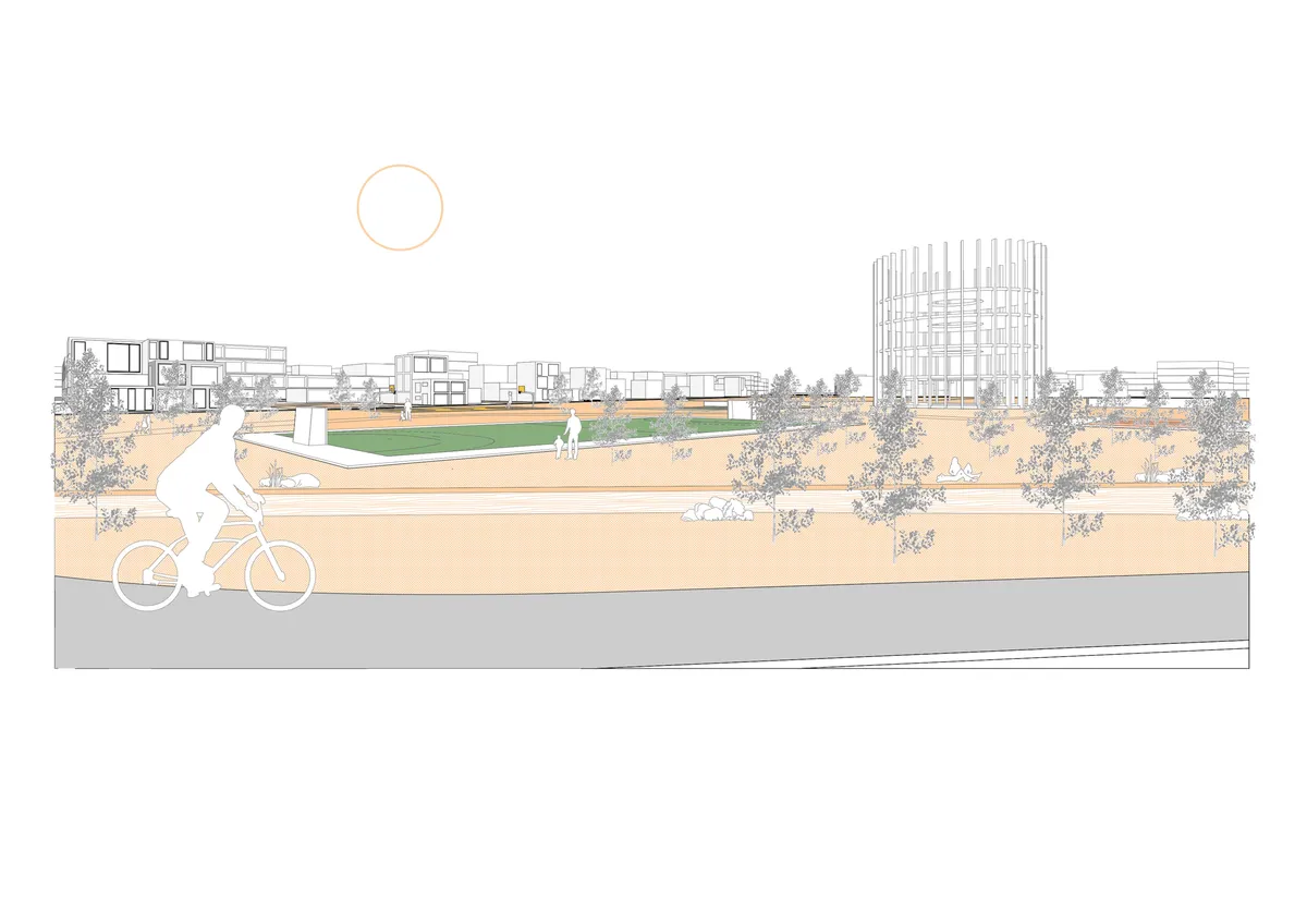 The presented project represents a manifesto to a general problem faced by contemporary cities related to the monofunctional character of the built mass, which becomes more and more accentuated as urban areas expand. Productive housing represents a concept in which the two functions, housing and production, interpenetrate and form a homogeneous environment, capable of self-sustaining and offering multiple possibilities for the use of urban space. The development of the productive character of cities requires the capitalization of spaces with active potential and their transformation into flexible spaces, adapted to the requirements of contemporary cities, where various companies, local businesses and startups can integrate within the community. The location proposed for this project is part of an industrial area of the city of Timișoara, which is in the process of being defined from an urban point of view, where industrial areas come into conflict with residential areas and the rest of the related services in the vicinity. The objective of this project was to define a built environment that makes the transition between living and production in the most natural way possible. The proposed location has a spatially undefined natural character, which is crossed sinusoidally by a water channel. This was one of the basic elements in defining the concept for this project. The central green area represents the core of the community, from which the built mass develops radially. The transition from natural to mineral and the grain of the buildings gradually increases from the core to the boundaries. Towards the limits, the ground floor of the buildings is dominated by small production areas, education, logistics areas, workshops, creative spaces for small entrepreneurs. It is a space where ideas are born and which becomes exposed to residents who can resonate and understand the processes behind it. On the upper levels, the privacy of the living is given by the italics that connect the building bodies and ensure a visual relationship with the ground floor area. In the interior areas, housing has a more dominant character and a lower height regime. In these spaces, living is complemented by common spaces that become work areas for people who work from home but want a more suitable environment in which to carry out their activity. The central area is dominated by a green core intended for relaxation and social interaction, essential for increasing the housing quality.