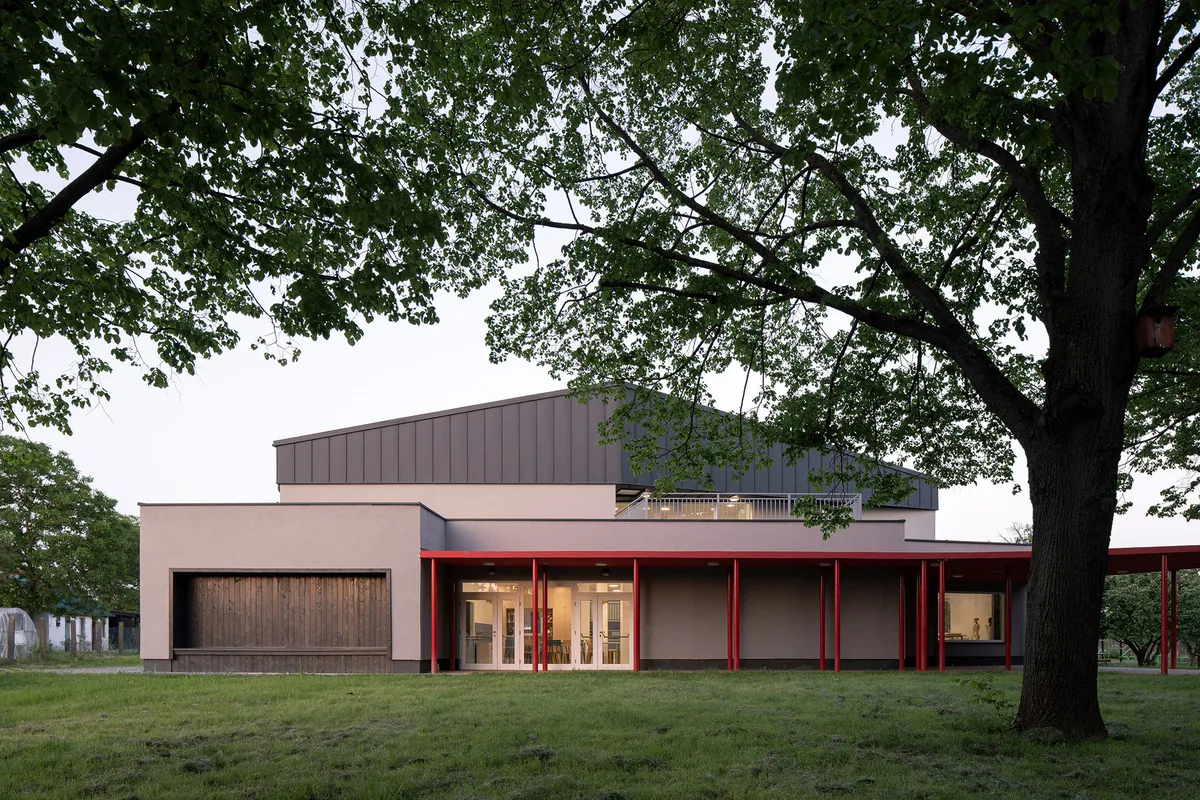 As the modern equivalent of the porch rooted in Hungarian rural architectural traditions, the learning clusters are connected by a red canopy, which also functions as an outdoor classroom. The function is divided into masses to keep the scale of the school proportional to its built environment. The organic connection with the settlement is provided by the garden, playground and sports park open to everyone outside of school hours.