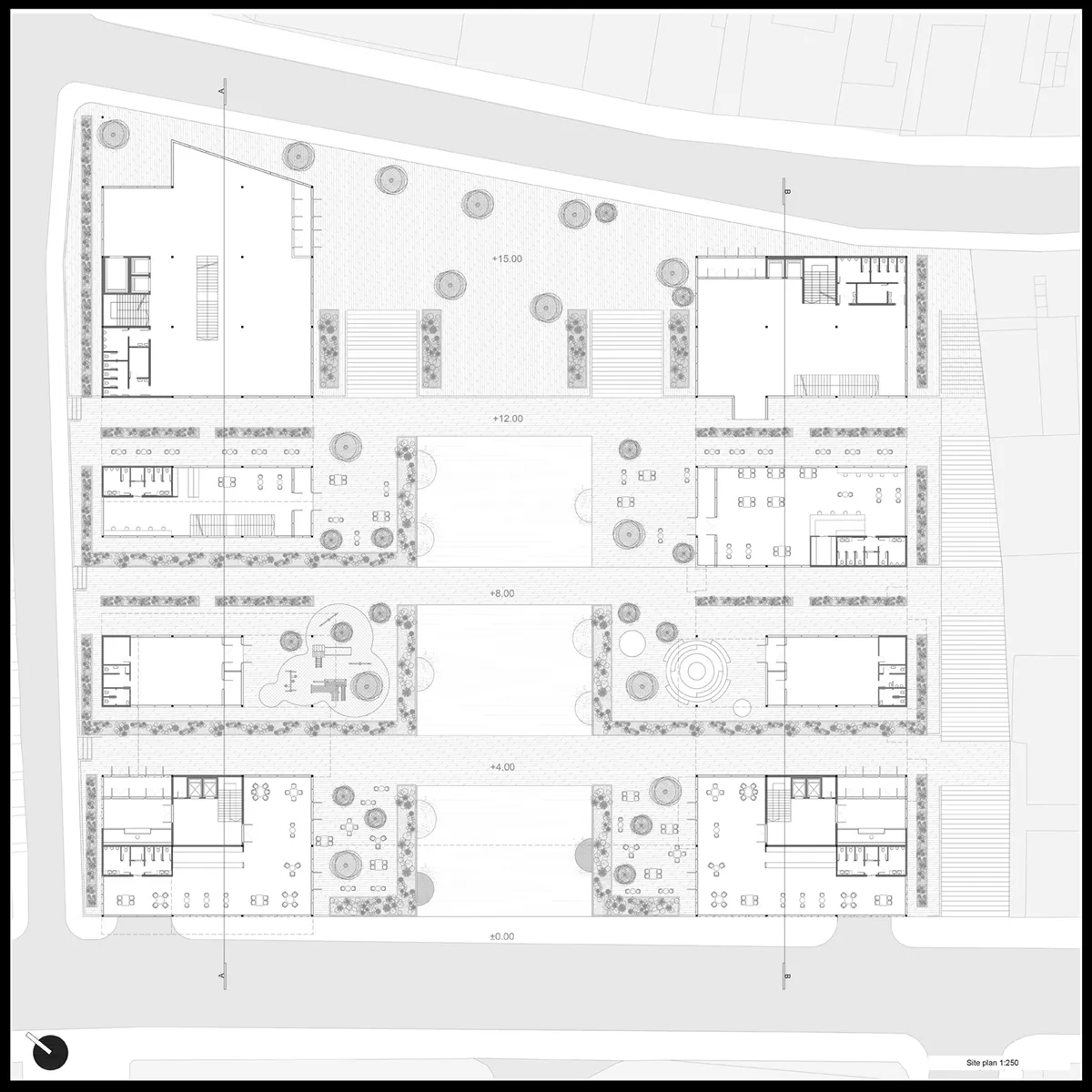 The ground level is designed as a buffer zone between the private and public parts of the block. To maximize the public and semi-public space, the ground floors are generally smaller in area compared to the rest of the building. This creates covered areas that serve the content present on the ground floors. Since the ground floors are mostly cafes or communal rooms for the residents of the residential block, the outdoor spaces of these zones include gardens and playgrounds, enhancing the community's leisure time.