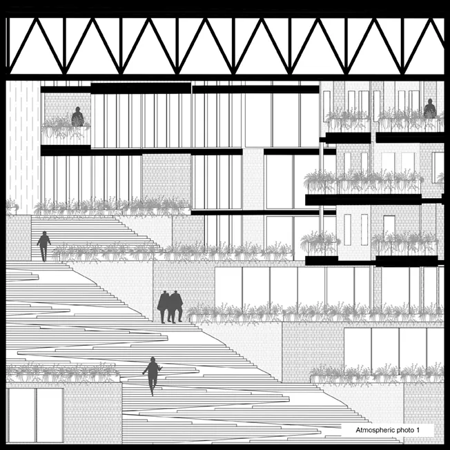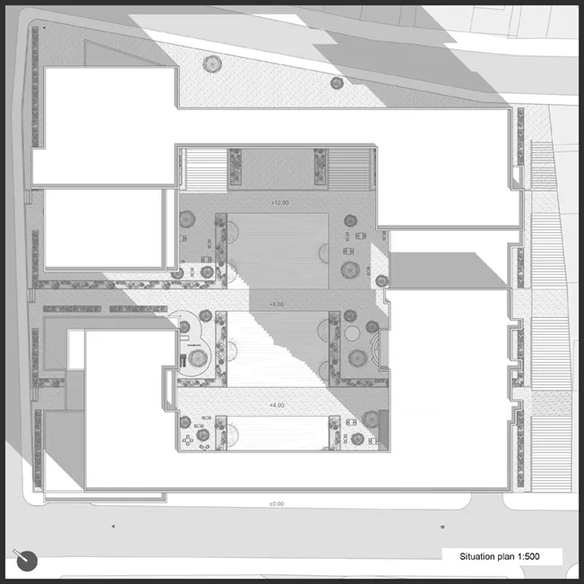 The built structure is positioned along the perimeter of the block to give the central part the function of a public space. The structure is functionally divided into two zones, which are individually subdivided into two sub-zones. The location is divided into four interconnected levels. They contain various types of content, while underneath them are rooms serving commercial and service facilities that are semi-underground. The structure on the first two ground levels serves residential purposes, while the structures located on the upper part of the location, on the other two levels, have a public function. The structure in the zones of the first and last ground level is characterized by portals located on the top floors of the structure. These represent common areas for users with a view. In the public part of the complex, these are service areas for employees or visitors, while in the residential part, the portals represent gathering places and areas for communal leisure activities. They also serve as a monumental entrance to the location.
