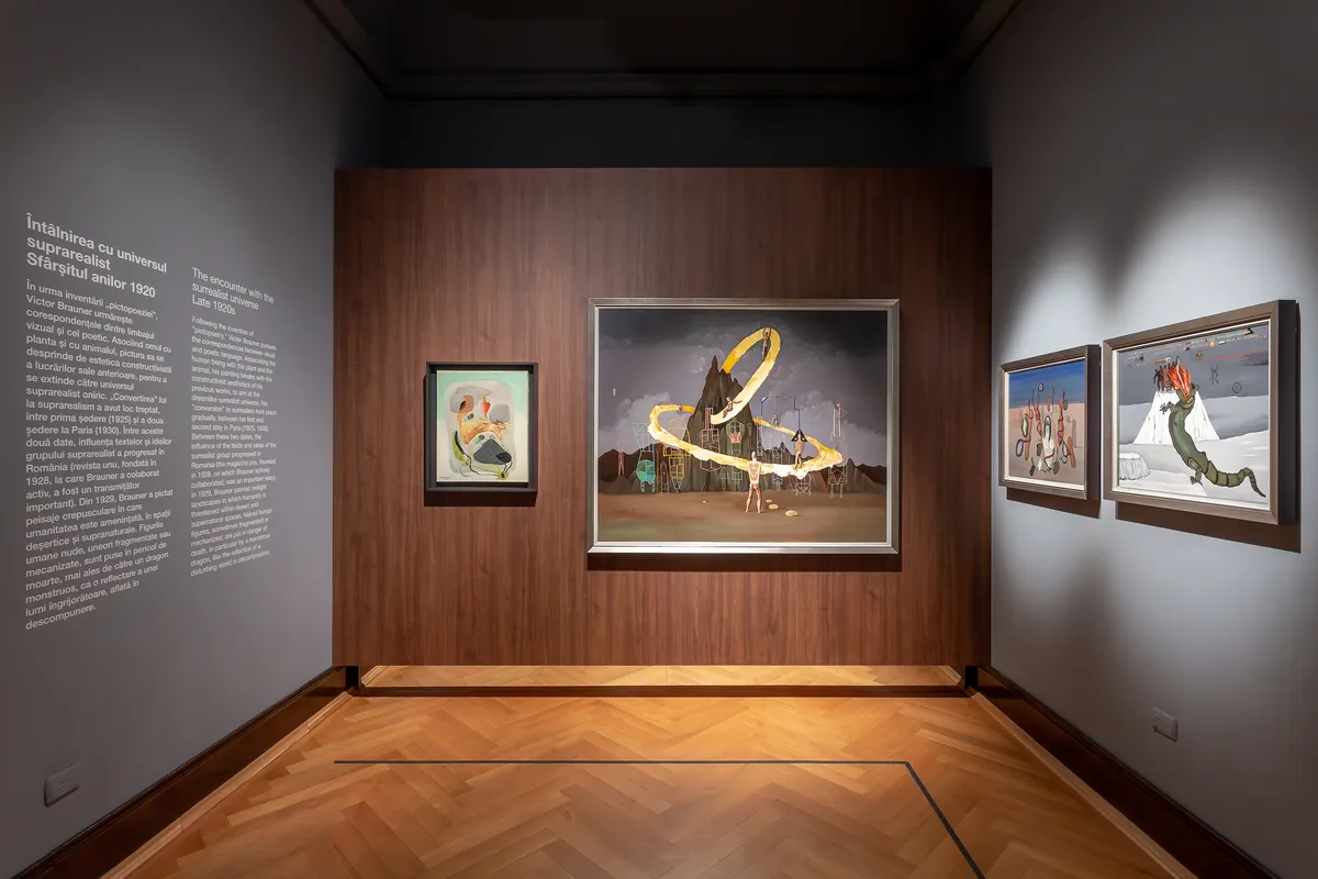 Inspired by the architecture of the period in which Victor Brauner's works were made, the design concept proposed the use of modernist elements, typical of the interwar period. In order to reduce the contrasting atmosphere of the rooms, a dark gray colour was used for the walls and ceilings, a typical shade for the modernist period, thus bringing the color of the walls and ceilings closer to the dark shade of the wooden elements.