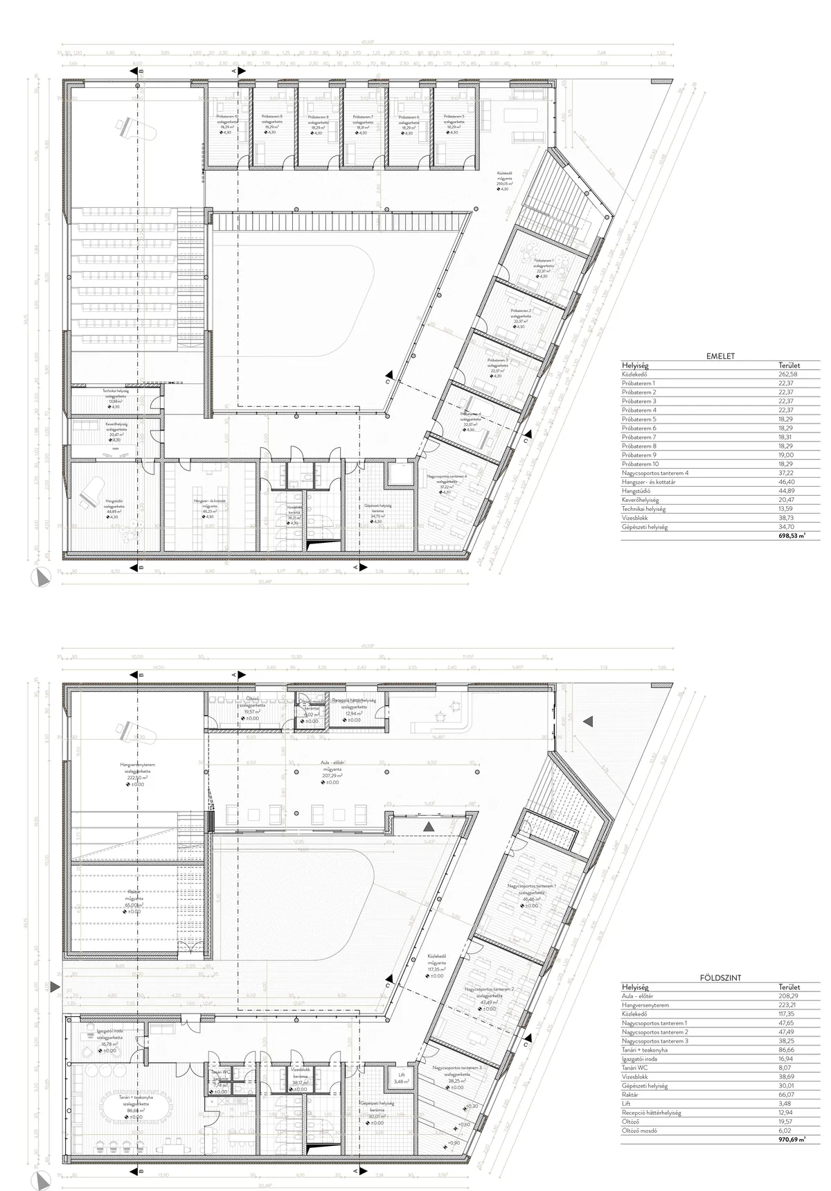 Diplomaprojektem keretein belül egykori zeneiskolámnak terveztem új épületet, mivel a jelenlegi épületet kinőtték, valamint az épületfizikai és funkcionális szempontokból is használhatatlanná vált. A tervezési telek Vecsés központi részén, két forgalmas út kereszteződésében található a városközpont és a lakóövezet határán. Az épület tömegalakításával és anyaghasználatával szerettem volna reagálni erre a kettős környezetre, átmenetet és összeköttetést alkotni régi és új között. A földszinten kaptak helyet a nagycsoportos kamara- és szolfézsórák termei, a tanári részleg, valamint a két szintet lépcsőzetes nézőtérrel összekötő, a koncertekkor elkülöníthető, de alapvetően közösségi térként szolgáló hangversenyterem. A tágas aula teljes hosszában összenyitható a védett belső udvarral, amivel a szabadtéri koncertek és táborok alkalmával fedett-nyitott, átmeneti terek hozhatóak létre. Az emeleten kerültek kialakításra az egyéni- és kiscsoportos órák próbatermei, valamint a zeneiskola és a város zenészei által is régóta hiányolt hangstúdió is. Műszaki megoldásait tekintve igyekeztem a lehető legjobban hasznosítani az épített tereket, mindezt fenntartható és környezettudatos módon. A ház magastetős léte ellenére nincsenek kihasználatlan tetőterek, az emeleti próbatermek teljesen kitöltik az épületburkot, aminek praktikussági és energetikai szempontjai vannak. A keleti és északi utcafrontokra néző termek az oktatás ideje alatt (általában délután) már nem mindig kapnának elég fényt az utca felől, ezért a magastető ellenkező irányba néző nyugati és déli síkjáról délután is elegendő természetes fény jut a leginkább használt terekbe. Ez a megoldás a természetes szellőztetést is megkönnyíti, valamint a téli időszakban a szoláris nyereség növeléséhez is hozzájárul. Anyaghasználatát tekintve a homlokzatokon a hagyományosnak tekinthető téglaburkolat mellett, pontosabban az alatt (annak „alapjaként”) látszóbetonnal találkozhatunk, ami a tégla egyfajta parafrázisa értelmezésem szerint. Ezek a betonfelületek emelik ki az épület bejáratait, valamint a szerelt téglaburkolattal karöltve egy olyan nehéz homlokzatburkolatot alkotnak, amelyek nem csak energetikailag, hőtároló tömegként válnak a ház javára, hanem a funkcióból adód fokozott akusztikai követelményekkel szemben is megállják helyüket. A belső terekben a látszóbeton kendőzetlen határozottságát oldó fa burkolatok és nyílászárók jellennek meg, melyeknek fontos akusztikai szerepe is van.