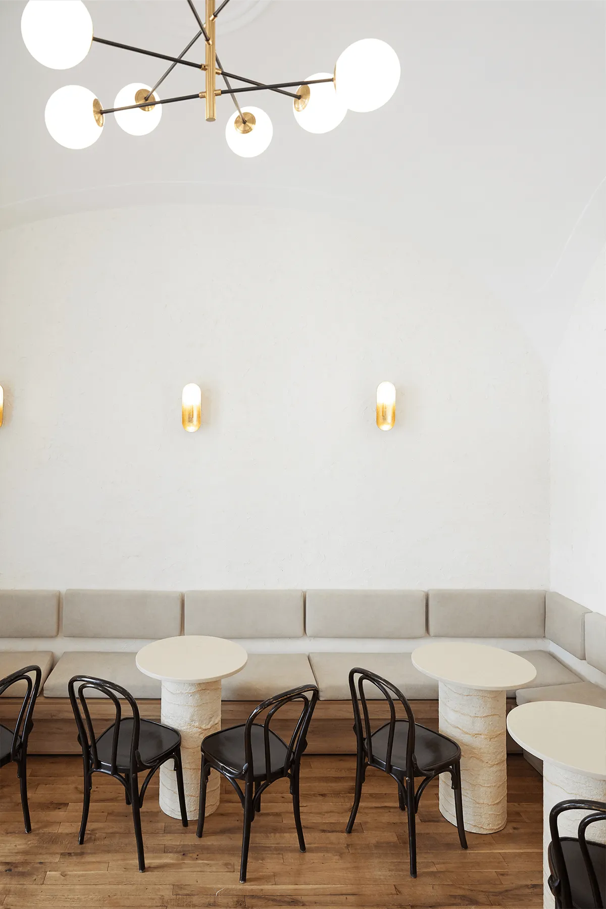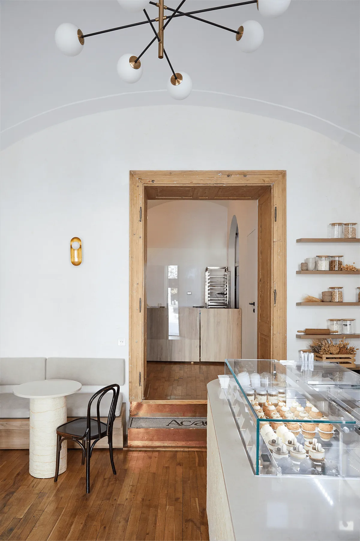 Situată în inima orașului, pe una dintre cele mai vechi străzi ale acestuia, noua cofetărie a beneficiat de câteva detalii arhitecturale care numai în acest context istoric se pot regăsi în forma lor autentică și care toate, împreună, ne-au pus la dispoziție un canvas deosebit pentru noua funcțiune. Zona accesibila clienților e alcătuită din două încăperi unite între ele printr-un gol de usa amplu, pus în evidență de tâmplăria din lemn masiv care îl încadrează, alături de un detaliu foarte special - mozaicul amplasat pe treapta dintre cele doua spații, care conține logoul cofetăriei și care este realizat din nu mai putin de 2000 de piese ceramice așezate una câte una. În prima încăpere, cea cu acces direct din stradă, avem o zonă de servire și tejgheaua cofetăriei, unde am încercat să realizăm un context cât mai neutru, mai luminos și mai liniștit vizual, în care elementul cheie este finisajul aplicat pe pereți - o tencuială tradițională pe bază de var cu fibre de cânepă, care dă nu doar personalitate spațiului, ci și coerență. Tonurile neutre, dar calde, de cremuri și bejuri se continuă și la nivelul finisajelor alese pentru bar, mobilier, tapițerie, pentru a asigura o curgere cât mai fluidă a privirii în interiorul încăperii, având ca focus final produsele expuse în vitrinele minimaliste din sticlă. A doua încăpere adăpostește încă o zonă mică de servire, alături de bucătăria deschisă - aici clienții pot vedea întreg procesul de pregătire a preparatelor servite și pot simți aromele biscuiților proaspăt scoși din cuptor. Tot aici a fost păstrat și un perete pe care au rămas evidente straturile anterioare de tencuiala aplicate, ca o mărturie a istoriei clădirii, adăugând un layer suplimentar de autenticitate spațiului.