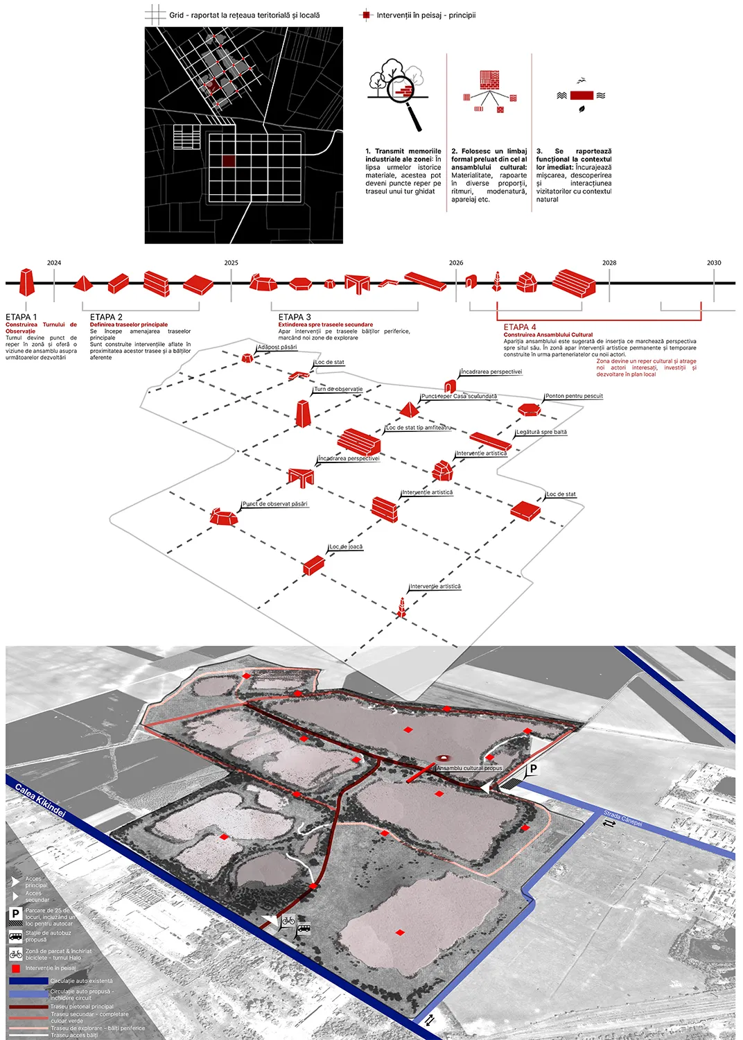 Zona bălților din Jimbolia reprezintă un peisaj cultural complex, atât prin istoria importantă a industriei sale de ceramică, ce a conturat identitatea comunității locale, cât și prin biodiversitatea peisajului natural-antropic, format în urma declinului industrial. În lipsa oricărei urme materiale care să ateste povestea industrială a locului, regăsită astăzi doar în memoria colectivă a comunității care a trăit-o, aceasta va dispărea odată cu trecerea generațiilor. Proiectul a avut ca miză adresarea acestei istorii intangibile. Proiectul a pornit de la conceperea unei sistematizări strategice cuprinzătoare care să creeze, la nivel macro, o imagine coerentă și unitară. Această sistematizare a constat în implementarea unui masterplan al zonei, ce urmărește integrarea unei serii de inserții în peisaj într-un un grid raportat la rețeaua locală și teritorială. Această rețea, alcătuită din puncte, articulații în peisaj, dialoghează cu piesa centrală - ansamblul cultural, transmițând ideea unui muzeu ce se extinde pe întregul peisaj. În cel mai important loc din masterplan-ul zonei bălților, ansamblul cultural apare drept un gest liniar ce se materializează în imaginea unui zid de cărămidă, care devine, totodată, o arhivă de materiale și însemne, o poartă care primește publicul în zona bălților, un fundal pentru vegetația pe care o traversează și un mijloc de a primi mișcare în interior și deasupra sa. Linia este în sine și o casă în care sunt găzduite funcțiunile ansamblului între cele două ziduri, creând astfel o succesiune de spații și curți interioare: Centrul de Artă & Cercetare spre S-V, iar spre N-E Muzeul. Efortul sintezei dintre funcție, gest artistic și discurs intelectual a ghidat proiectul până în etapa lui finală. Nu întâmplător numele acestuia este și ”Between the Lines”. Proiectul face apel tocmai la o astfel de lectură, adâncă și sofisticată, printre linii, folosind arhitectura în sens aproape literar. Arhitectura este configurata nu atât pentru a adăposti cât pentru a crea misanscena unei experiențe spațiale atent regizate. Linia este în fapt o frază și o poveste. Arhitectura este deopotrivă regie și scenografie. De-a lungul ei spațiul poate fi descris în acte. Zidul ca intrigă. Materialul ca leitmotiv. Spațiul ca figură de stil. Forma ca metaforă. Traseul ca fir epic spre un deznodământ sau alatul.