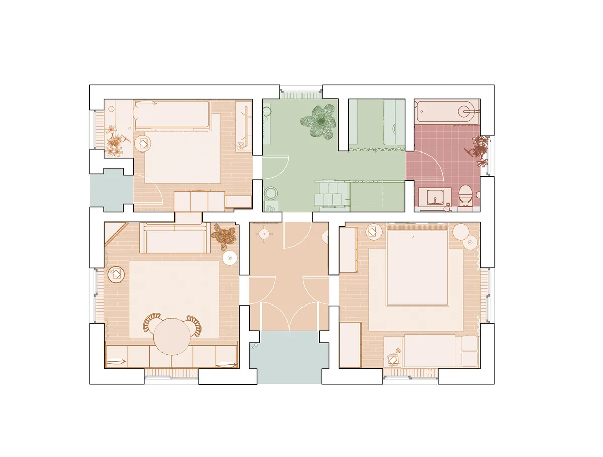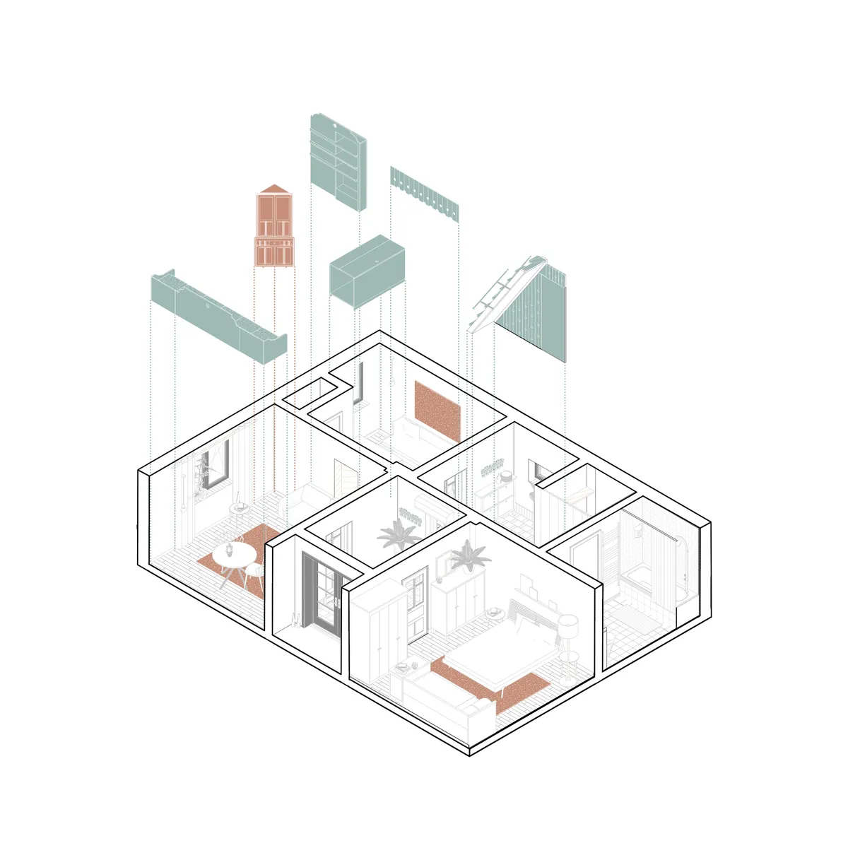 Transformarea Casei Copilăriilor din Corhana este un exercițiu de păstrare a moștenirii de familie, de-a lungul procesului de modernizare a unei case părintești din chirpici. Toate intervențiile funcționale și estetice au presupus o negociere de materiale și mijloace de implementare tradiționale, din dorința de a conserva caracterul casei. Confortul termic a fost îmbunătățit, păstrând detaliile originale ale pereților. Zona podului a fost recuperată și redată familiei ca spațiu multifuncțional de joacă și odihnă. Muchiile „dulci” ale pereților au fost reparate și finisate cu tencuieli pe bază de argilă. Tavanele au revenit la placarea cu lambriu de lemn, iar placările ceramice ale pardoselilor încălzite evocă vechile sobe. O parte din colecția de covoare țesute a fost folosită la tapițarea pernelor și a laviței. Mobilierul personalizat și scara interioară spre pod au fost realizate în atelierul din gospodărie și se îmbină armonios cu piesele noi și reutilizate.