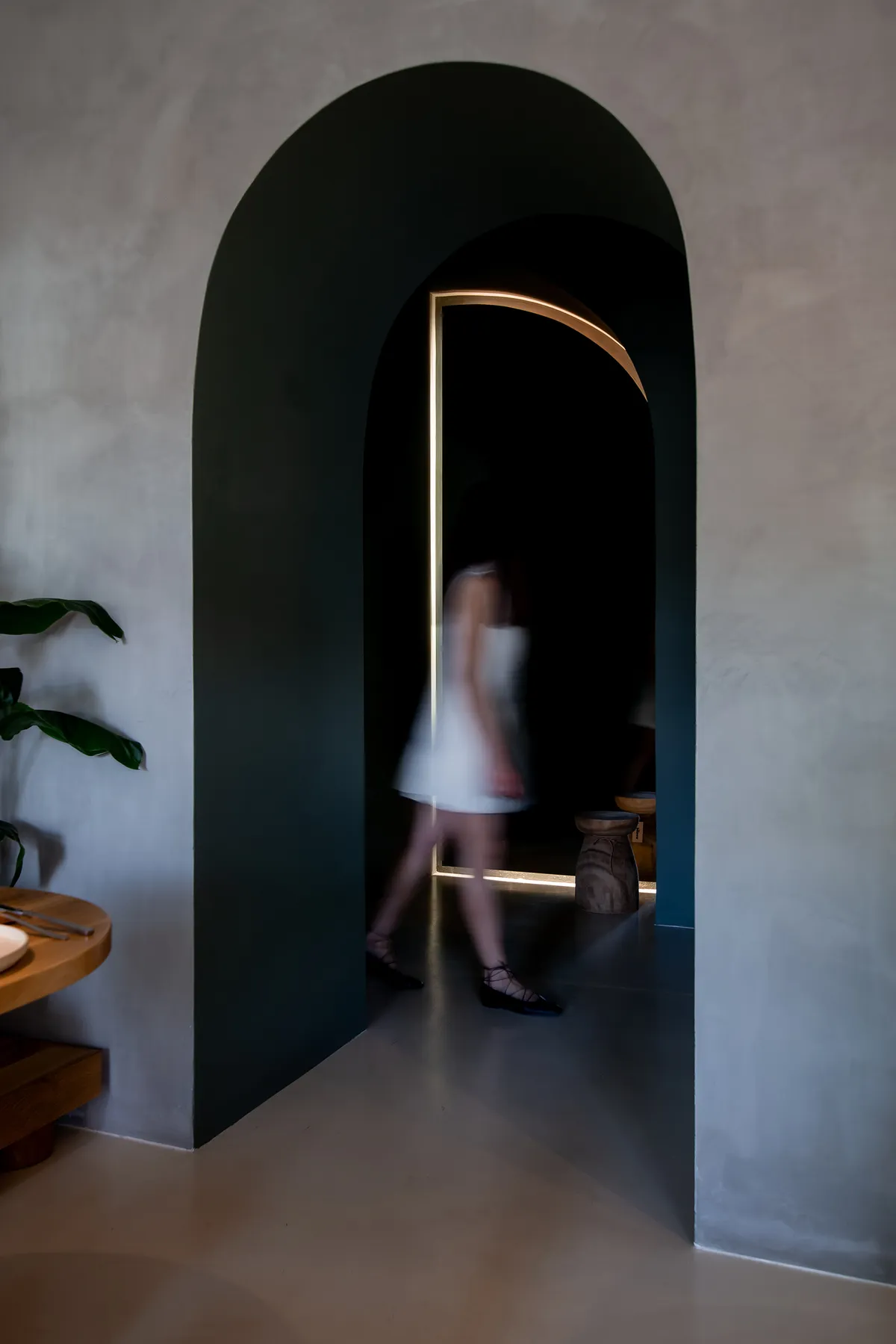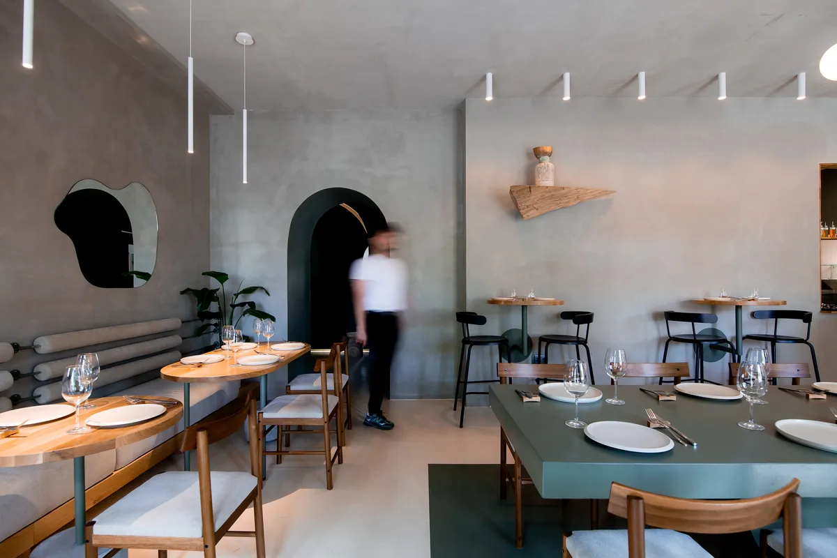 Locatia Ferment Maia se definește printr-o combinație armonioasă de elemente moderne și tradiționale, reflectând esența bucătăriei sale prin intermediul designului interior. Spațiul este gândit pentru a oferi o experiență culinară deosebită, într-un ambient elegant și primitor. Fiecare detaliu, de la oglinzile organice la masa centrală și frontul barului, este conceput pentru a crea un echilibru perfect între estetică și funcționalitate, transformând fiecare vizită într-o experiență memorabilă. Spațiul Ferment impresionează printr-un design minimalist, în care predomină liniile curate și formele organice. Pereții de un gri cald, cu textură fină, oferă un fundal neutru care permite elementelor de design să iasă în evidență. Această alegere cromatică creează o atmosferă relaxantă și elegantă, punând în valoare lumina naturală ce pătrunde generos prin ferestrele mari. Un punct de atracție este reprezentat de oglinzile cu forme organice, montate pe peretele principal. Aceste oglinzi nu doar adaugă adâncime și dinamism spațiului, dar și reflectă lumina, amplificând senzația de deschidere și fluiditate. Suspendate deasupra meselor, corpurile de iluminat moderne, cu forme cilindrice alungite, contribuie la atmosfera intimă și rafinată. Barul este placat cu piese volumetrice de la Ton Beton, aducând un contrast modern și sofisticat. Piesele de beton, cu motive circulare, adaugă o textură interesantă și un aspect contemporan. Raftul de lemn, sculptat de artistul Dan Visovan, completează designul barului, oferind un spațiu de expunere pentru colecția de vinuri și băuturi fine. Iluminatul de accent subliniază textura lemnului și a betonului, creând un joc de lumini și umbre care adaugă profunzime și caracter. Masa centrală, vopsită într-un verde profund, reprezintă punctul de convergență al spațiului. Aceasta este concepută nu doar ca un element de design, ci și ca un loc de socializare, unde clienții pot interacționa și împărtăși experiențe. Designul său robust, cu un suport semicircular, oferă stabilitate și un aspect estetic plăcut. Masa este amplasată strategic pentru a facilita circulația și a crea o zonă comună convivială.