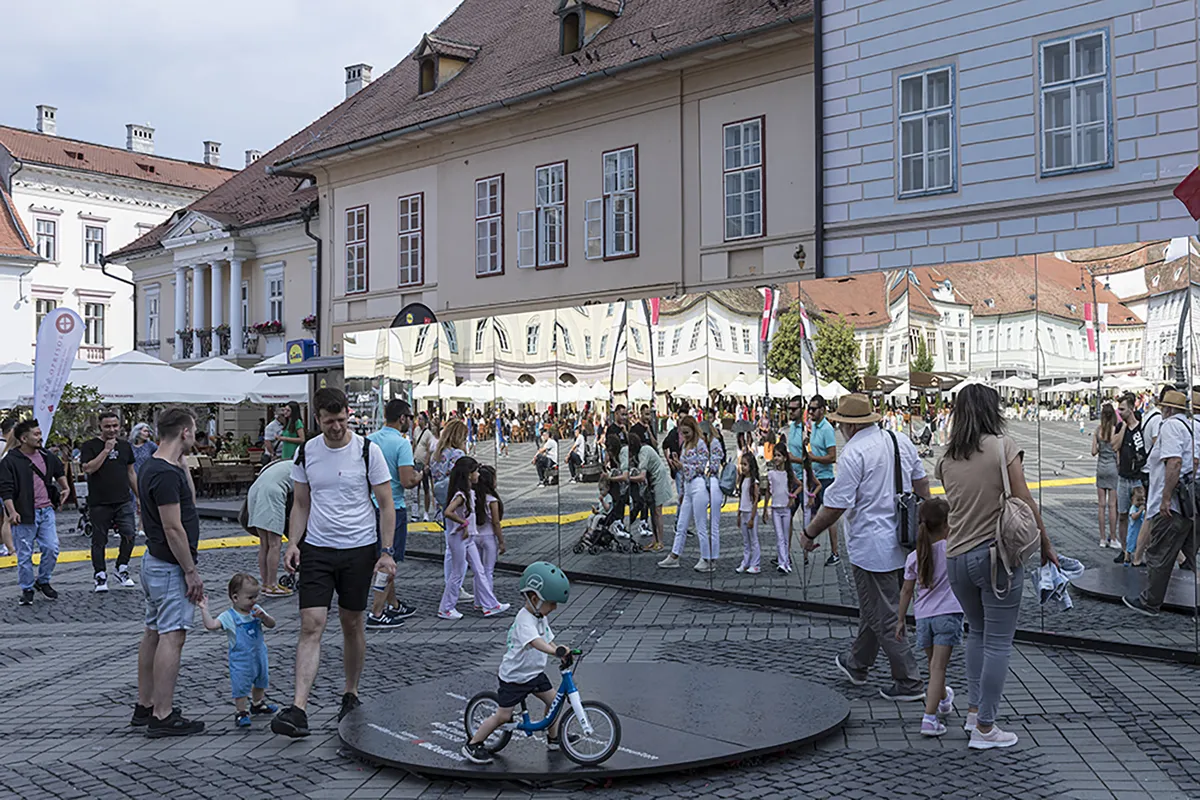 Instalația Mirror Your Community, din cadrul Festivalul Internațional de Teatru Sibiu, vorbește despre oameni, despre spațiu public și despre un festival care, prin cultură, aduce oamenii în spațiu public. Oglinda e să nu te mulțumești cu ce vezi în ea, oglinda e să te bucuri de tine cel care se privește dar care își acordă timp să nu privească doar suprafața formei atractive. Oglinda e să înțelegem că avem valoare doar împreună și că fiecare cu el însuși contribuie la binele comun. Oglinda e conștientizarea bunul comun, a patrimoniului moștenit, a unui oraș în care au coexistat mai multe culturi și generații, conștientizarea unui timp, că nu doar prezentul contează și că prezentul are valoare prin moștenirea lui. Moștenirea înseamnă urme construite dar și memorie individuală. Festivalul Internațional de Teatru Sibiu celebrează arhitectura aducând spectacolele în spațiu public, făcând din fațadele clădirilor o mare scenă sau un mare fundal pentru locurile întâlnirilor oamenilor. Clădirile nu mai sunt doar ale listelor de patrimoniu ci sunt un patrimoniu viu prin oamenii orașului. Propunerea nu este o așa-zisă oglindă, ci mai degrabă, este un zid lung, fin, subțire, de 18 metri lungime, cu o înălțime de 2 metri și jumătate cu o caracteristică aparte și anume aceea de a arăta. Toate zidurile clădirilor arată ceva. Fațada unei clădiri este un zid și arată o față a clădirii, dar fațada clădirii nu are sens fără interiorul clădirii și fără exteriorul ei. Cu alte cuvinte, o față nu reprezintă doar o interpunere între două medii. Acest zid lung este o suprafață oglindată foarte clară. Suprafața asta oglindată foarte clară este o fotografie a tot ceea ce se întâmplă în afara dar și în interiorul unui loc. În afară fiindcă oglindește spațiul cetății - spațiul strângerii împreună - și, cel mai important într-un festival este aflarea împreună a oamenilor care caută cultură. Interiorul clădirii nu este vizibil, simpla situare în fața zidului, a oglinzii, nu permite vederea în parterul casei albastre. Imaginea va fi a unui parter al casei albastre decupat de imaginea publică. Oglinda transformă spațiul public. Aceasta arată cum sunt persoanele în acel spațiu public, dar permite și spațiului public să intre în clădire. Oglinda duce spațiul public și din perspectiva privitorului, aparții parterului casei albastre, împreună cu toți ceilalți care sunt lângă și se oglindesc în zid.
