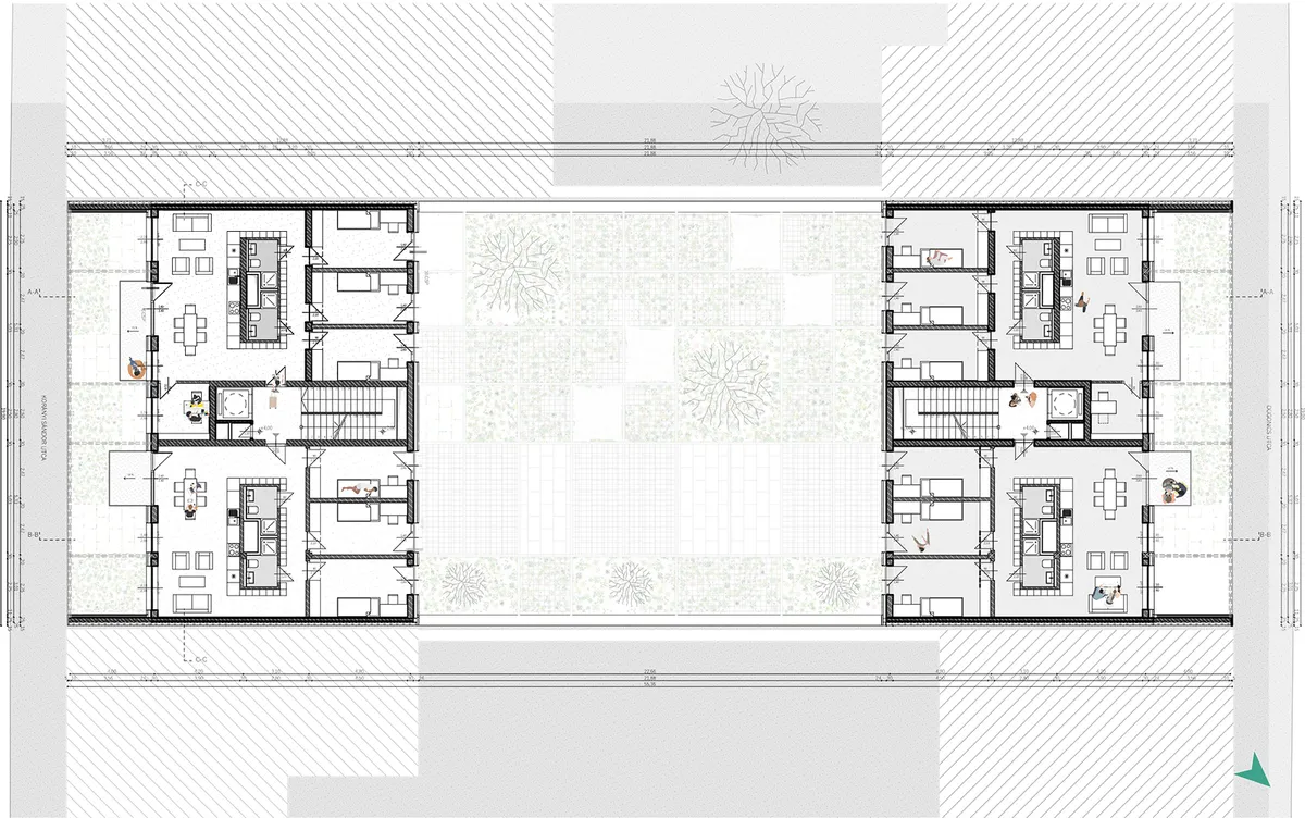 A földszinten egy kávézó-tanulótér, illetve egy önkiszolgáló mosoda kapott helyet. Szintenként 4 db lakás helyezkedik el, A lakások 95, illetve 102 m2 nagyságúak. A lakhatás megoldásán túl célom az alapvető közösségfejlesztés is, fontosnak tartom közösségi terekkel, térkapcsolatokkal elősegíteni a lakók közötti közvetlenebb kapcsolatot.